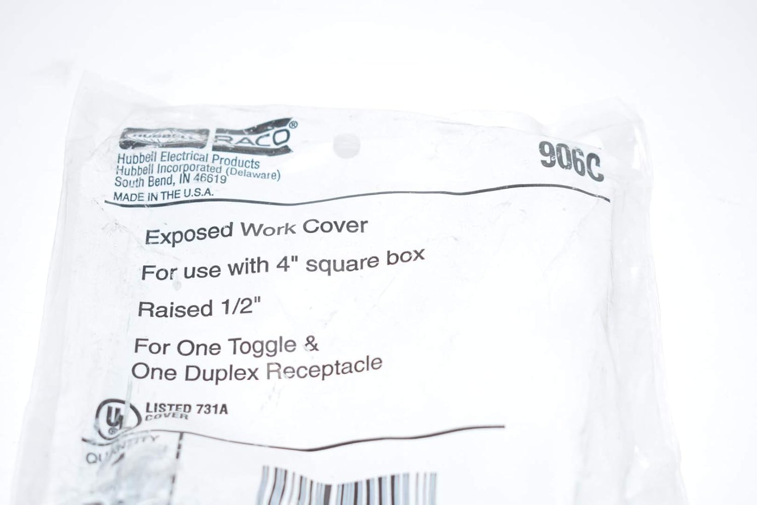 The Raco 906C is a four square toggle duplex cover designed for use in electrical applications. It is made from durable alloy steel and features a sleek metallic finish. With easy installation, this cover serves to protect electrical outlets effectively.