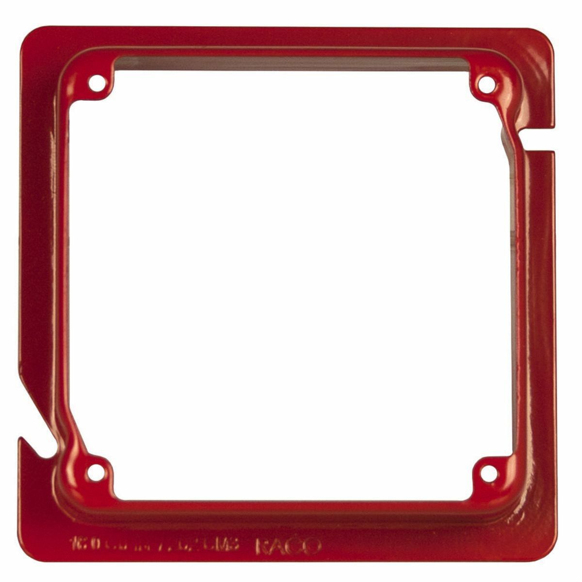 The RACO 911-17 is a square box cover designed for life safety applications. It measures four and eleven-sixteenths inches by four inches and includes a one and one-quarter inch raised feature. This product is constructed from pre-galvanized steel with a red finish, making it suitable for emergency exit signs and safety purposes.