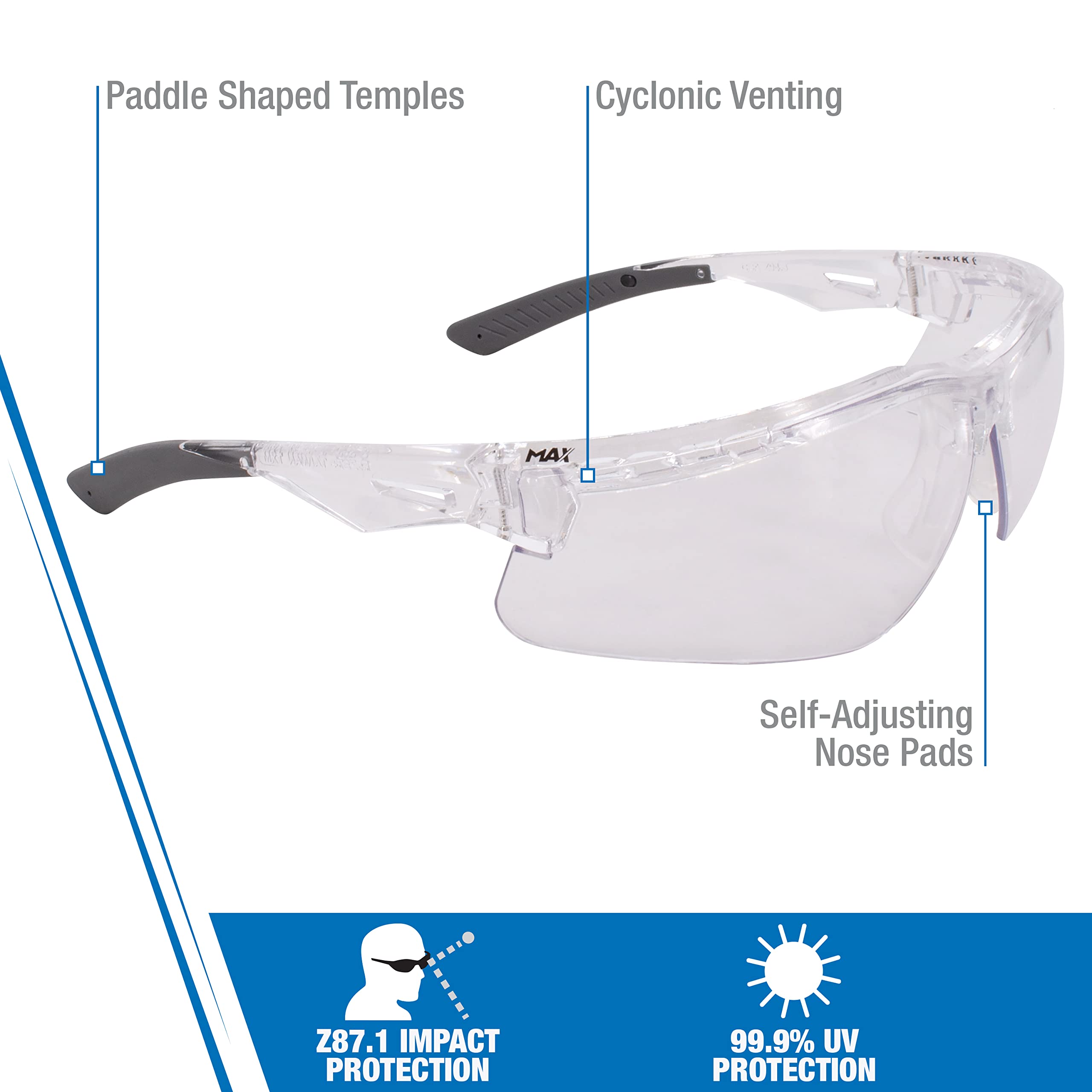 The Radians TXM1-10ID Thraxus Safety Glasses with clear lens and crystal frame provide high protection and comfort. These safety glasses are crafted with patented technologies and materials. They are ideal for professionals needing reliable eye protection.