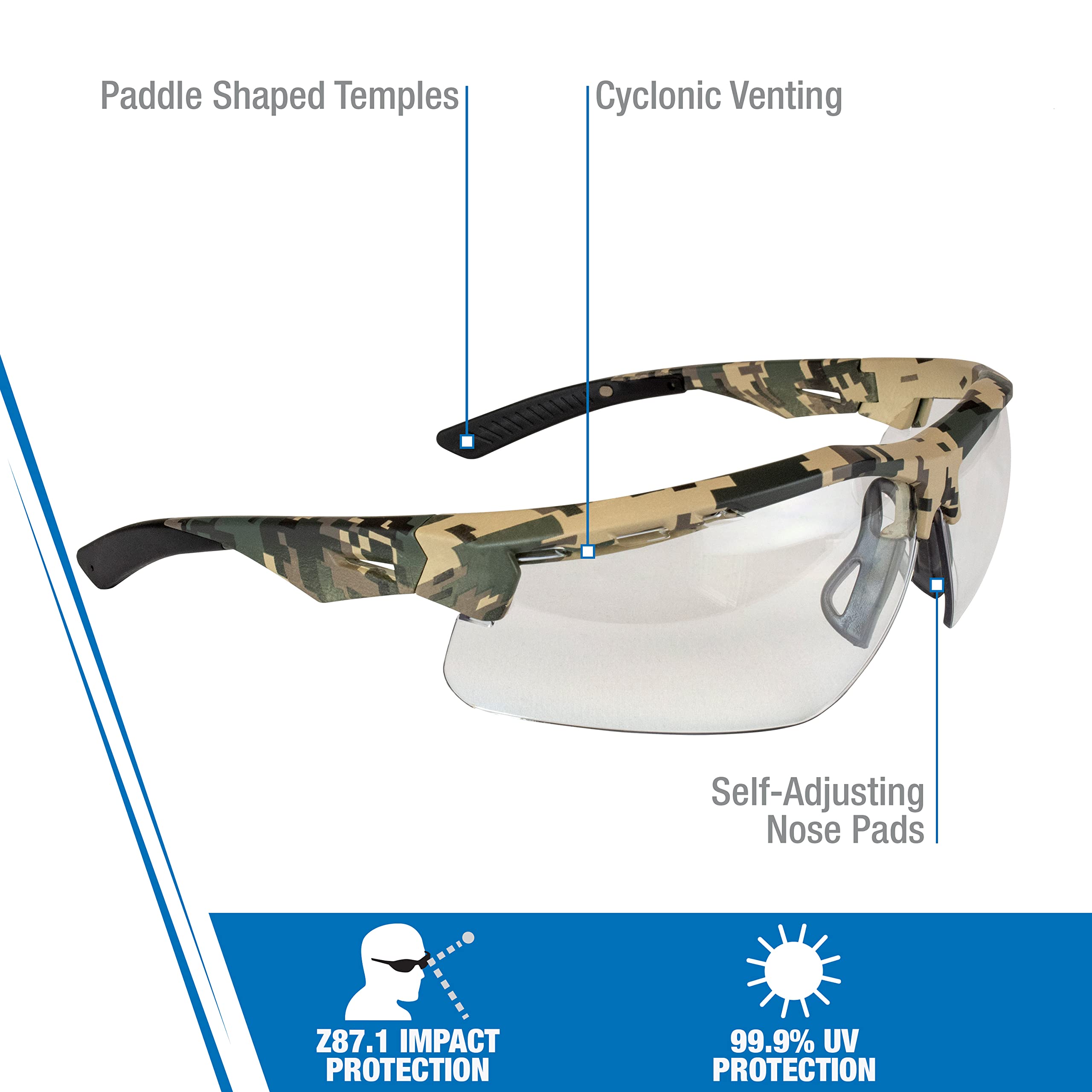 The Radians TXM4-11ID Thraxus Safety Eyewear offers advanced protection and comfort. Featuring a digital camo frame and clear anti-fog lens, it meets the demands of various work environments. Designed by Radians, this eyewear is a top choice for safety and style.