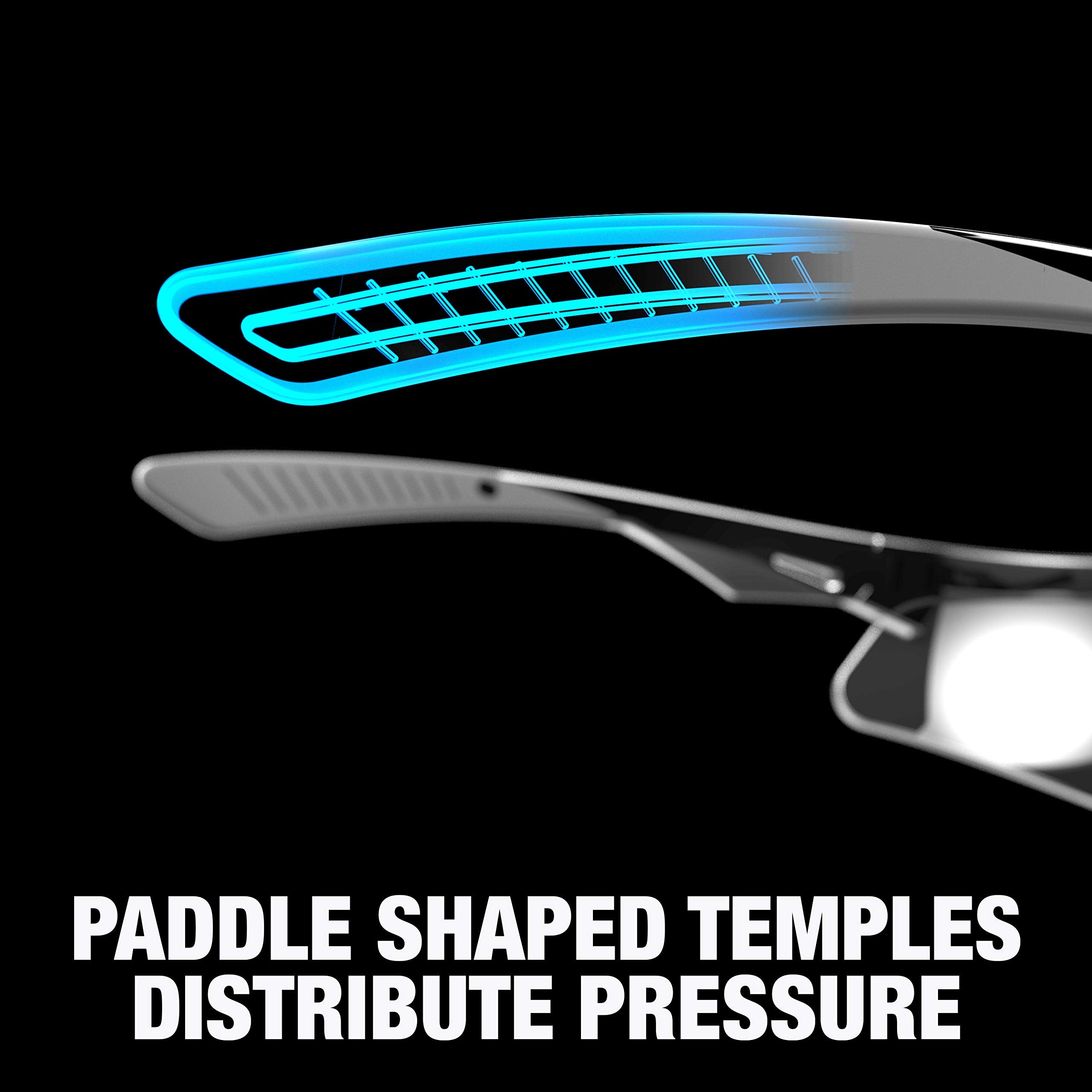 This eyewear features self-adjusting nose pads for stability and comfort. The cyclonic venting design improves vision by reducing fog. The paddle-shaped temples distribute pressure evenly for a better fit.