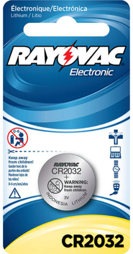 The Rayovac KECR2032-1G is a 2032 size 3 volt lithium coin cell battery. It is suitable for use in watches, calculators, remote controls, and medical devices.