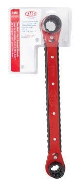 The Reed MPN 02690 is a versatile ratchet wrench designed for the gas and water industries. This tool has a total length of seventeen inches and features a unique dog bone shape, making it easy to use in tight spaces. The wrench includes four sockets: fifteen-sixteenths, one inch, one one-sixteenth, and one one-quarter inch, ensuring you have the right socket for various tasks.