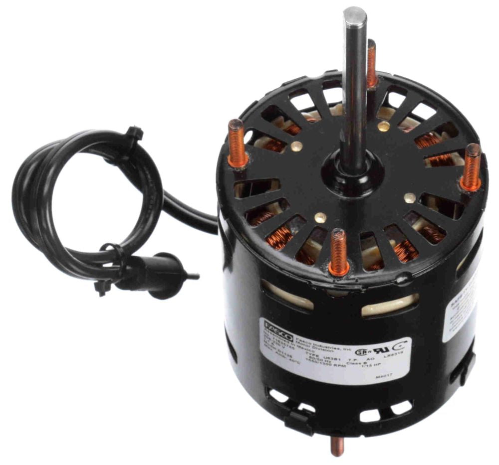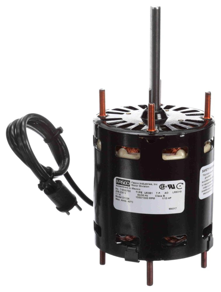 The Fasco D1126 is a refrigeration fan motor designed for various HVAC applications. This motor operates at a power rating of one-fifteenth horsepower (1/15 HP) and is suitable for voltage ranges from two hundred eight to two hundred thirty volts alternating current (VAC) at sixty hertz (Hz). It features a shaded pole design and utilizes a steel frame, ensuring durability in demanding environments.