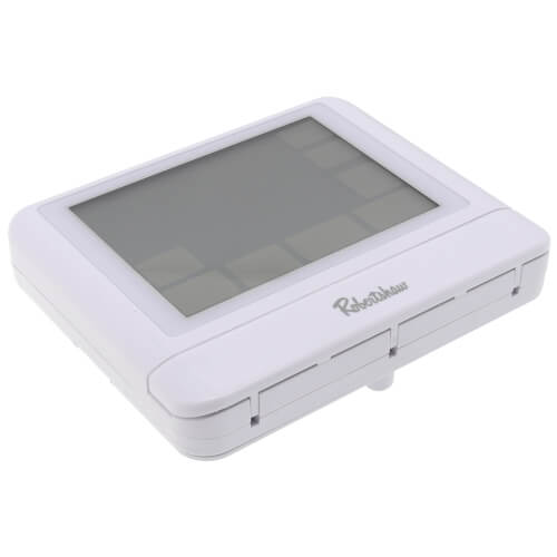 The Robertshaw RS9110T is a digital programmable thermostat designed for single-stage heating and cooling systems. This model allows users to set schedules over seven days with unique settings for weekdays, Saturday, and Sunday. The thermostat features a large touchscreen display for easy navigation and visibility.