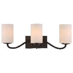 SATCO Vanity Light Fixture, MPN 60-5903, features a traditional design suitable for damp locations. This fixture operates on 120 VAC and has a maximum fixture wattage of 300 W. The fixture requires three A19 incandescent lamps with a maximum wattage of 100 W each. The white glass shade and aged bronze housing enhance its classic look while providing ample lighting.