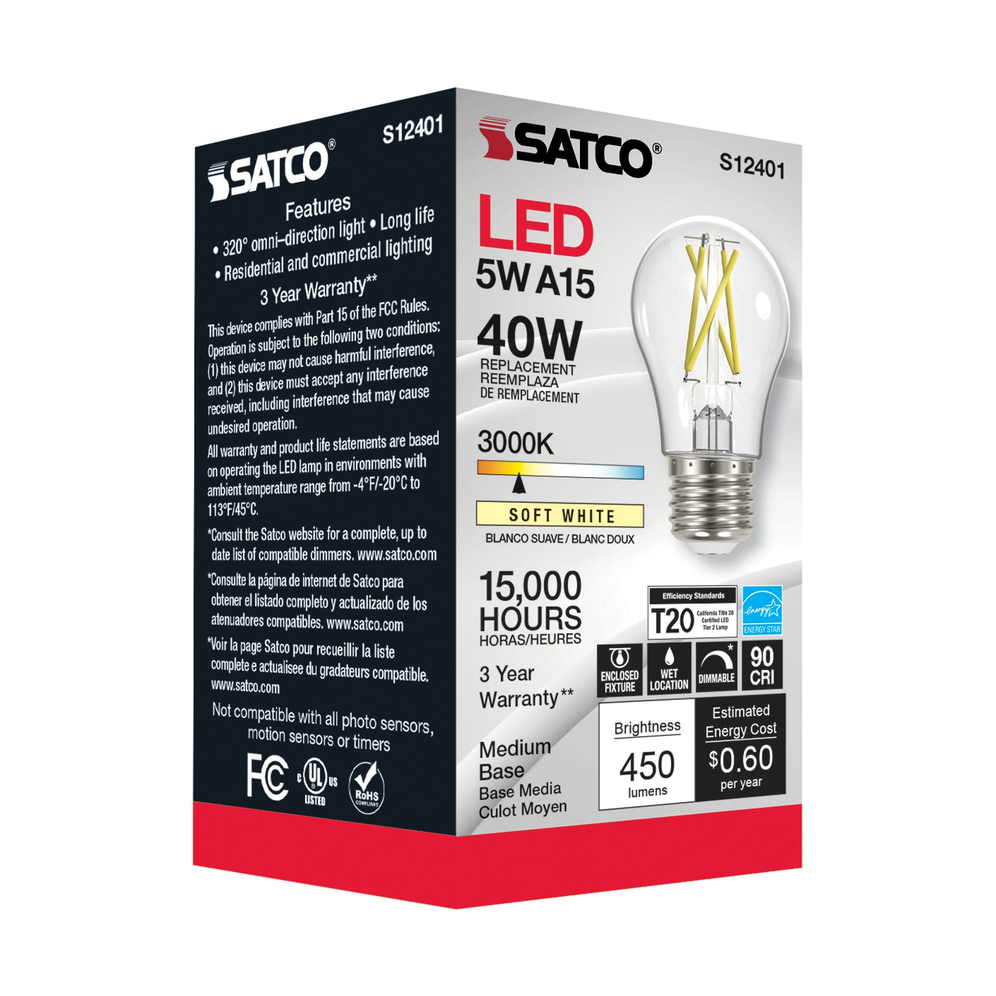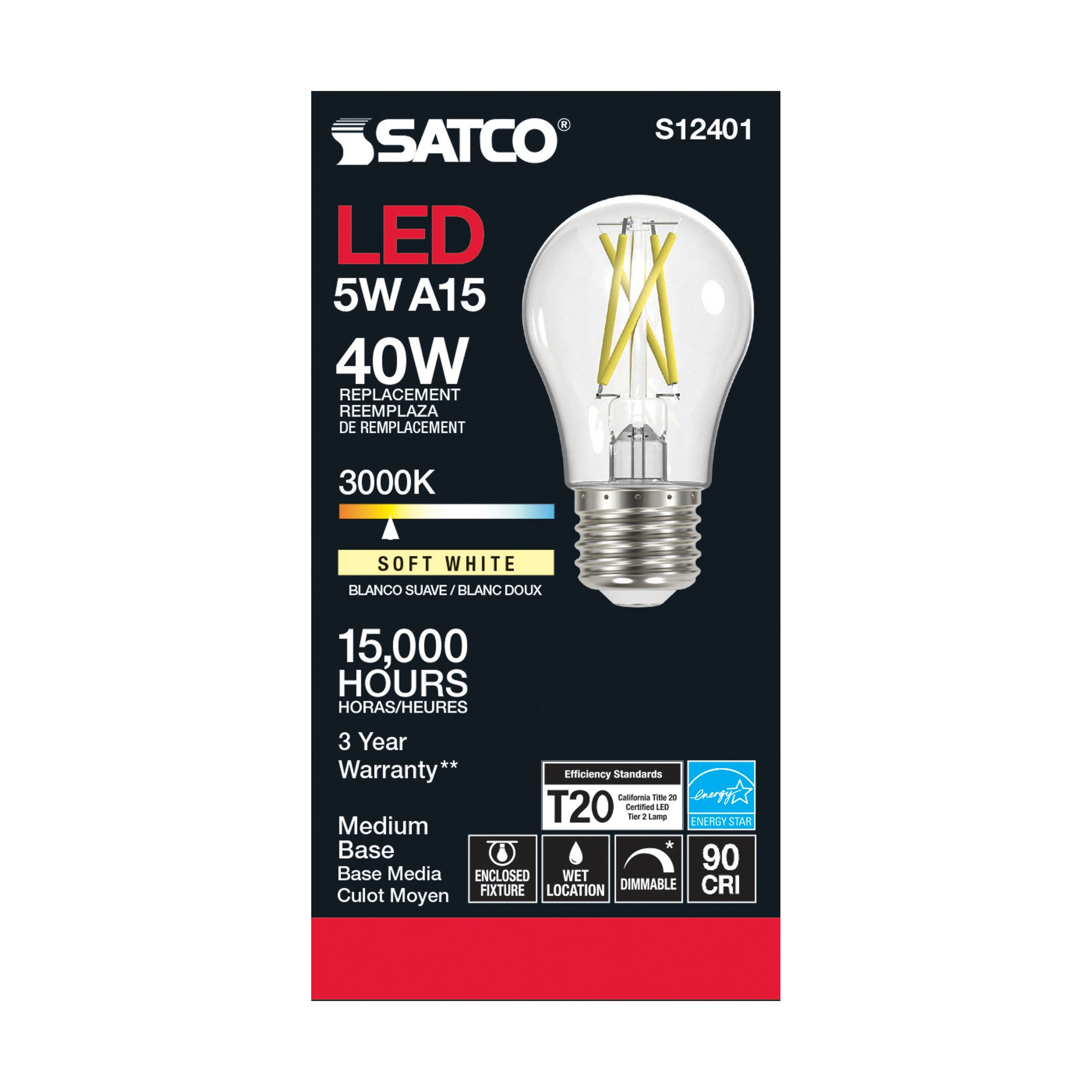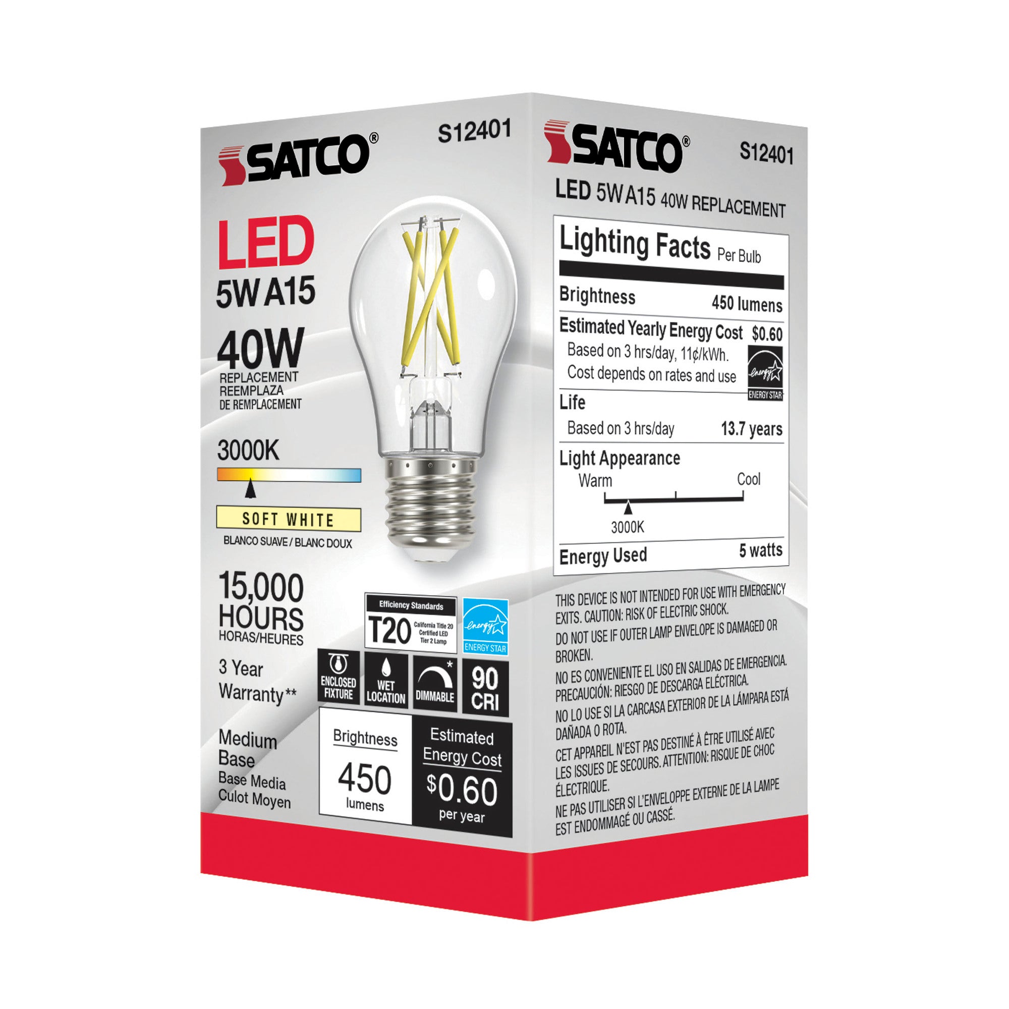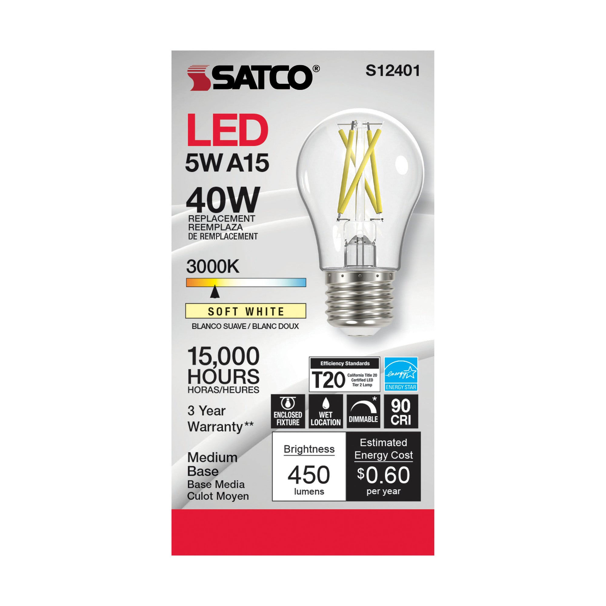 The Satco S12401 is a 5 watt LED A15 lamp designed for both indoor and outdoor use. This product features a clear medium base, delivering a soft white light at 3000K and a high CRI of 90. It is rated for 120 volts and provides an output of 450 lumens, making it suitable for various applications.