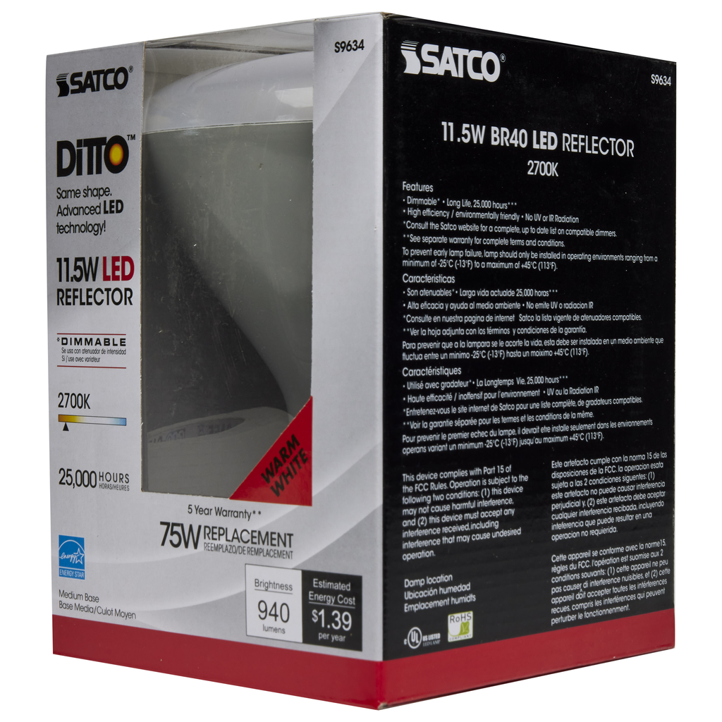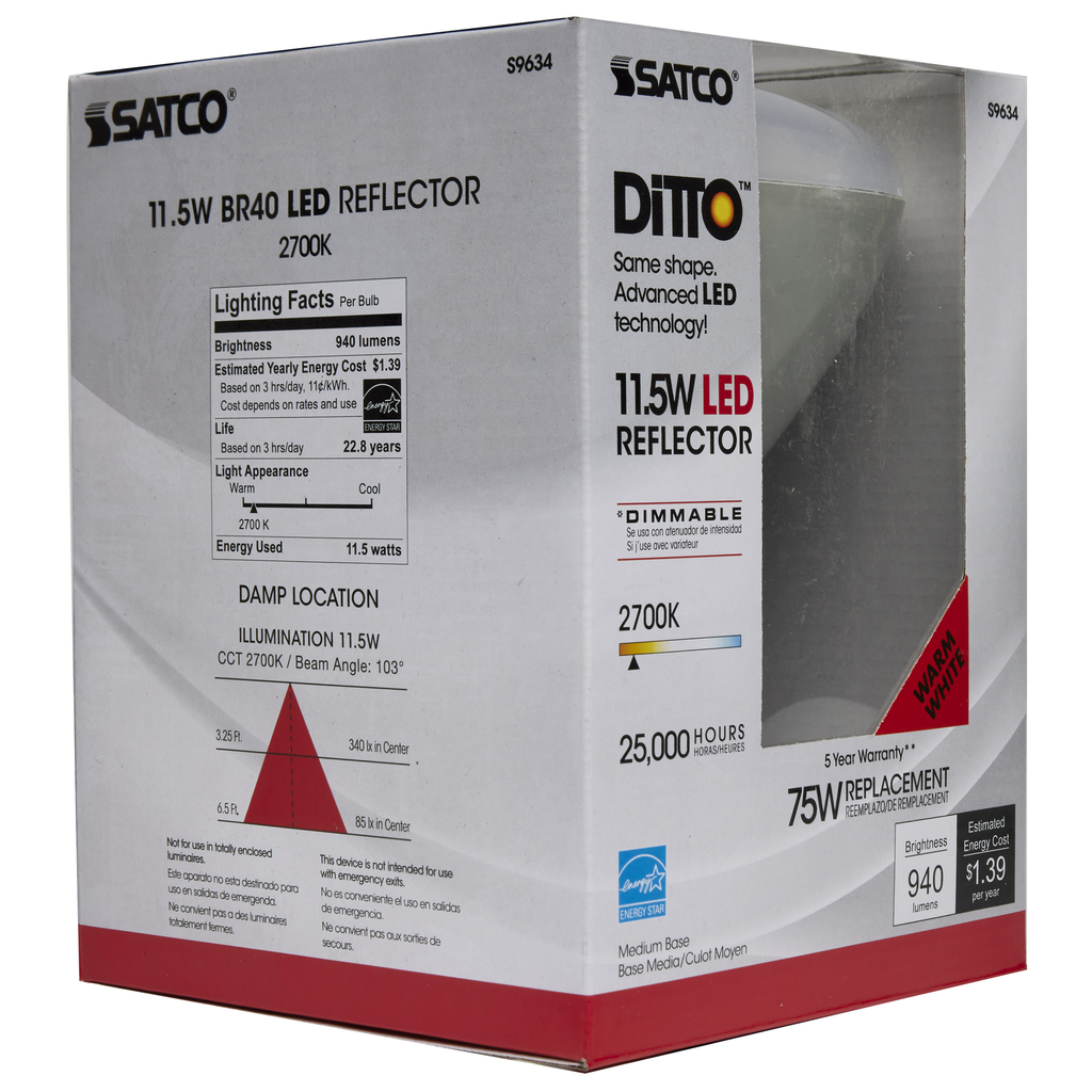 The Satco S9634 is an LED BR40 reflector bulb designed for effective indoor lighting. With a wattage of eleven point five, this bulb operates at one hundred twenty volts and offers a warm color temperature of two thousand seven hundred Kelvin. Its beam angle measures one hundred three degrees, suitable for various lighting applications.
