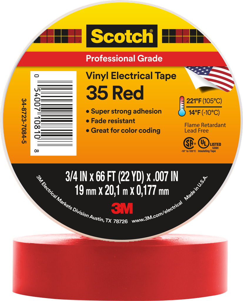 Scotch Vinyl Electrical Tape 35-3/4X66FT-RD is a premium-grade electrical tape made by 3M. This red tape has a length of sixty-six feet and a width of three-quarters of an inch. It is designed for reliable insulation and identification of electrical components.