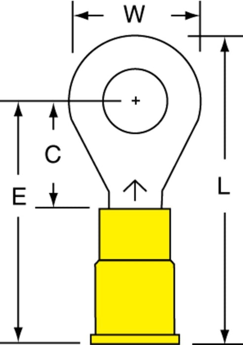The 3M Scotchlok MV10-14R/SX is an insulated standard ring terminal designed for conductors sized twelve to ten AWG. This component features a brazed seam barrel, ensuring a strong and secure electrical connection. It is equipped with a flared, vinyl sleeve that provides insulation and enhances crimping strength. The ring terminal is made from electrolytic copper, which is tin plated for resistance against corrosion. The product can handle temperatures ranging from negative forty to two hundred twenty-one degrees Fahrenheit.