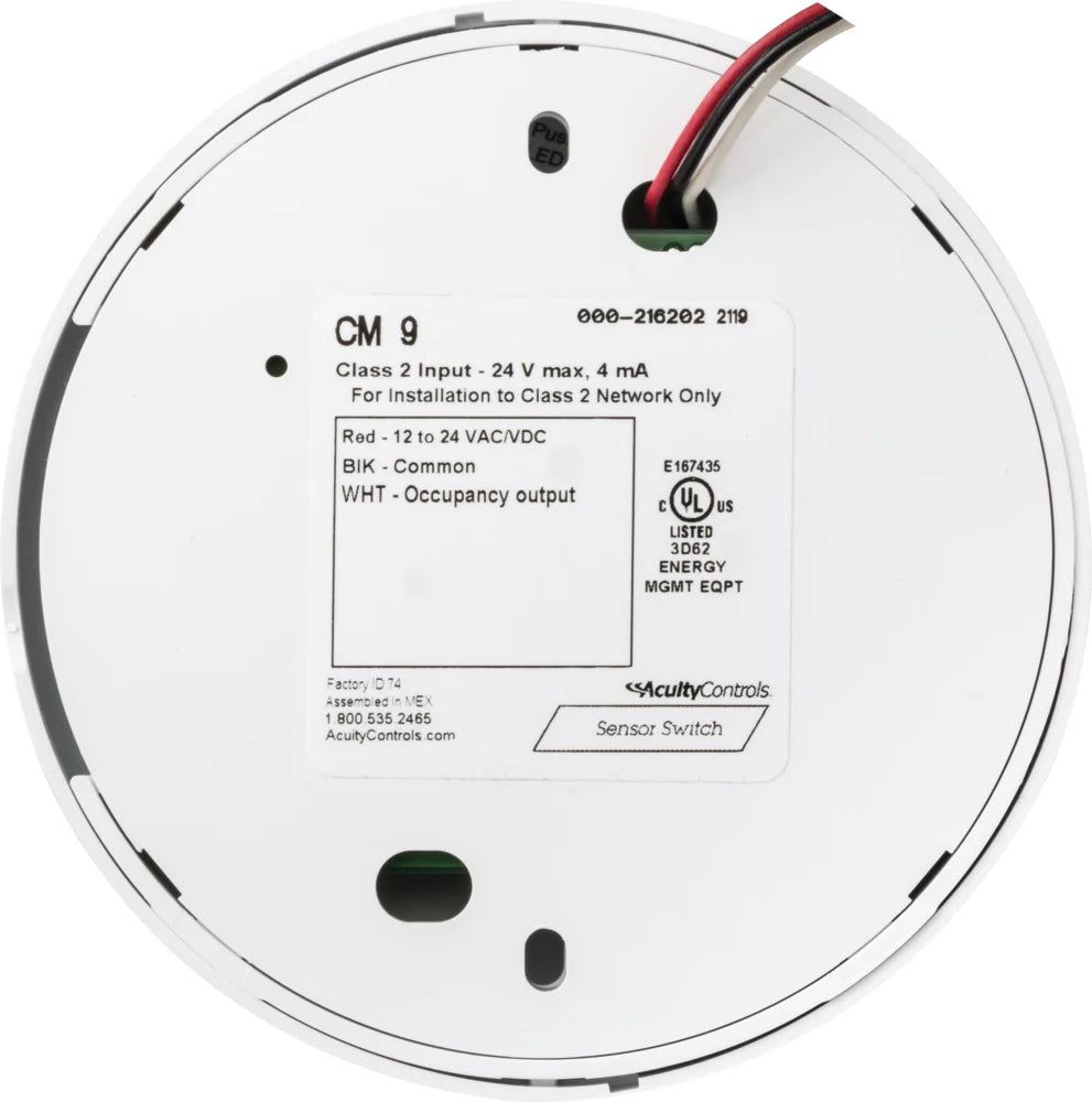 SensorSwitch CM9 is a small motion ceiling mount sensor designed for low voltage applications ranging from twelve to twenty-four volts. This sensor has a wide sensing range of three hundred sixty degrees, making it suitable for various indoor settings.
