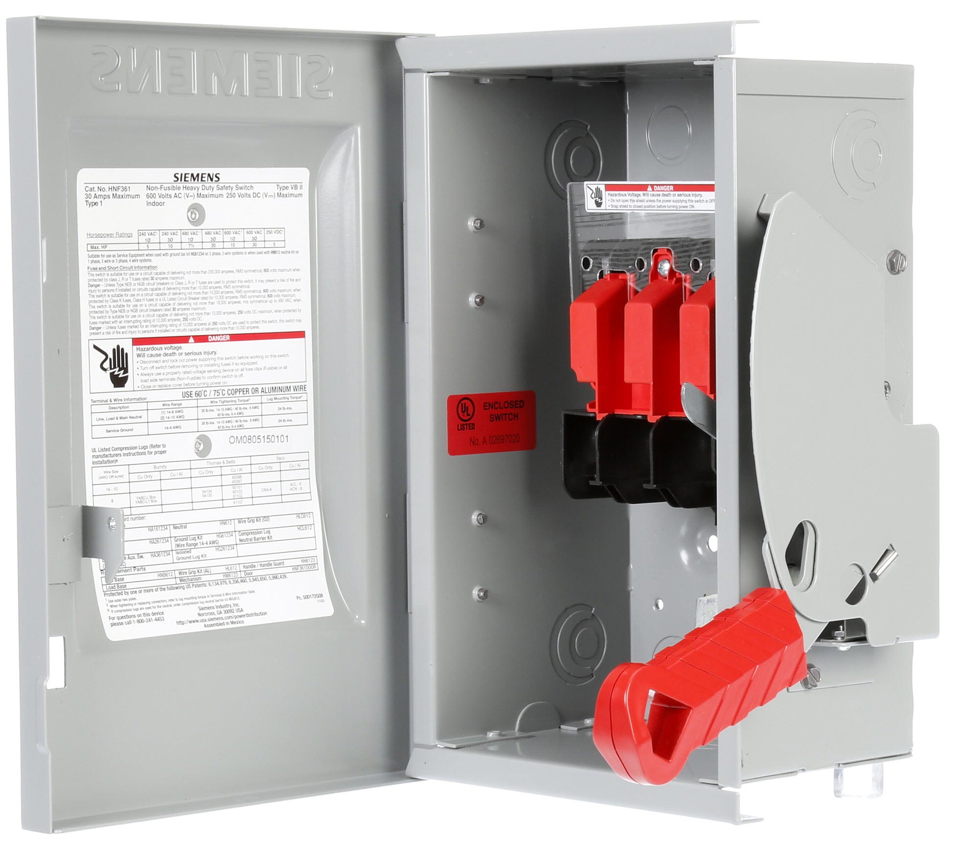 Siemens HNF361 is a safety switch designed for heavy-duty applications. This switch operates at six hundred volts and handles thirty amps. It is equipped with a three-pole and three-wire system, suitable for various industrial uses.