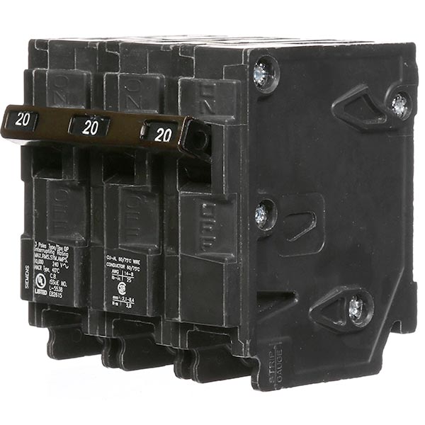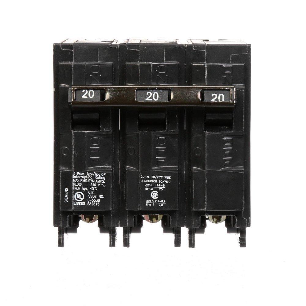 The Siemens Q320 is a 20 amp, three-pole circuit breaker designed for 240 volt applications. It features an interrupt rating of 10 kA, making it suitable for use in residential and light commercial settings.