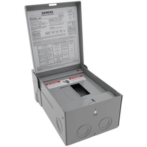 The Siemens W0204ML1060U EQ 60 Amp 2-Space 4-Circuit Outdoor Main Lug Load Center is designed for residential electrical systems. This load center is suitable for service entrance and features a NEMA 3R-rated enclosure to protect against outdoor elements such as rain and ice. The enclosure is constructed from G90 hot-dipped galvanized steel, providing durability and corrosion resistance.