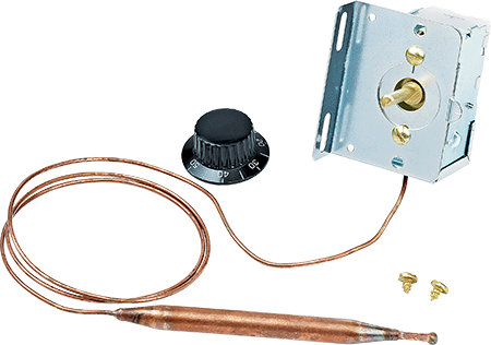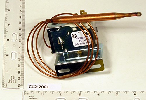 The Robertshaw C12-2001 SPDT Resistance Heat Thermostat is designed for heat pumps. It features a temperature range of -1 to 63 degrees Fahrenheit with a differential of 5 degrees Fahrenheit. The thermostat includes a 30-inch capillary and a 3/8 x 6 bulb, along with a knob for easy adjustments.