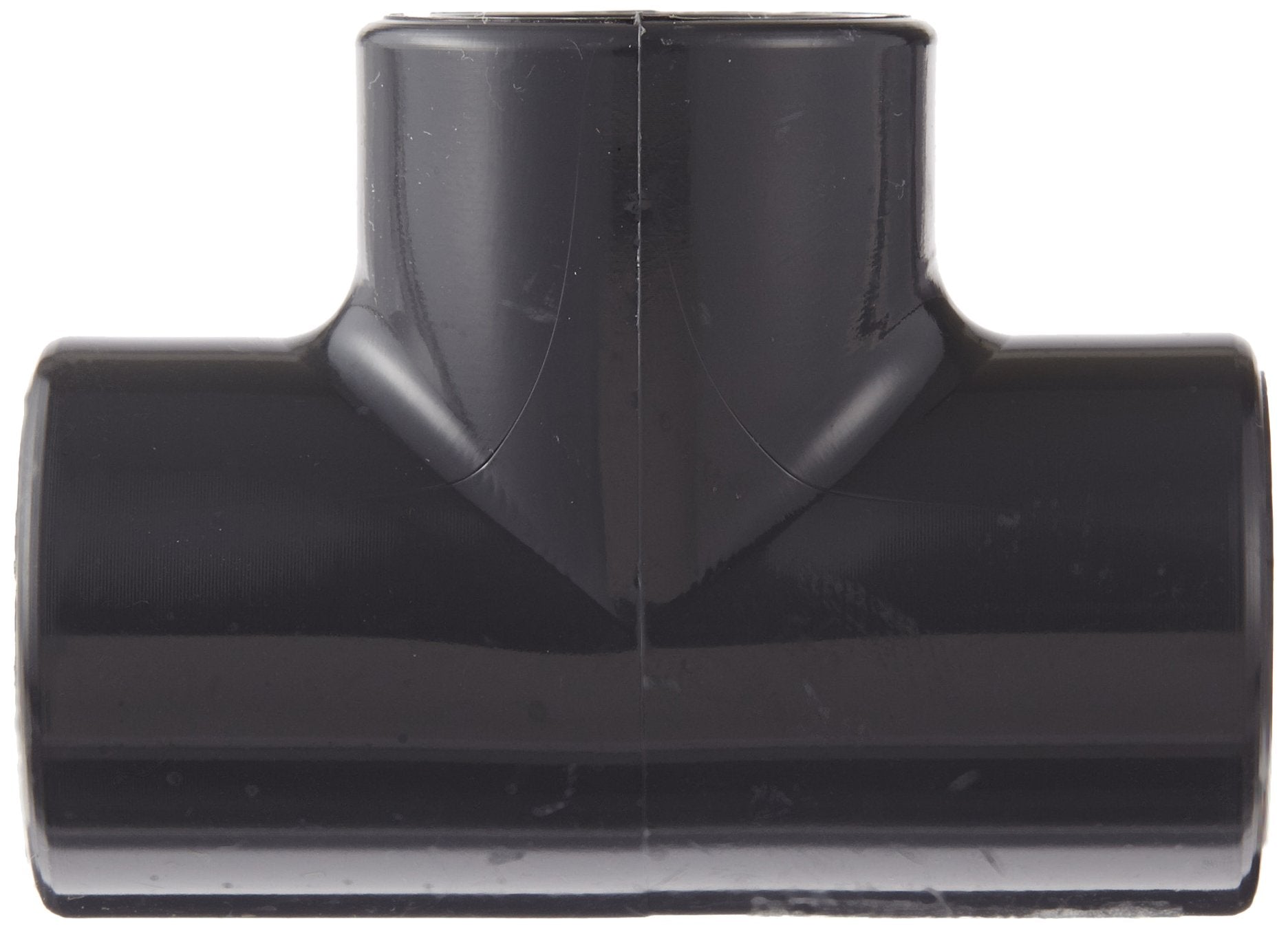 The Spears Manufacturing 805-005 is a schedule 80 PVC tee fitting that features female NPT threads on each end. This component is designed for branching and connecting three pipes easily. The tee structure allows for a main run with one side branch at a 90-degree angle. It is crafted from durable gray PVC, which ensures chemical resistance and strength, making it a suitable choice for various applications.