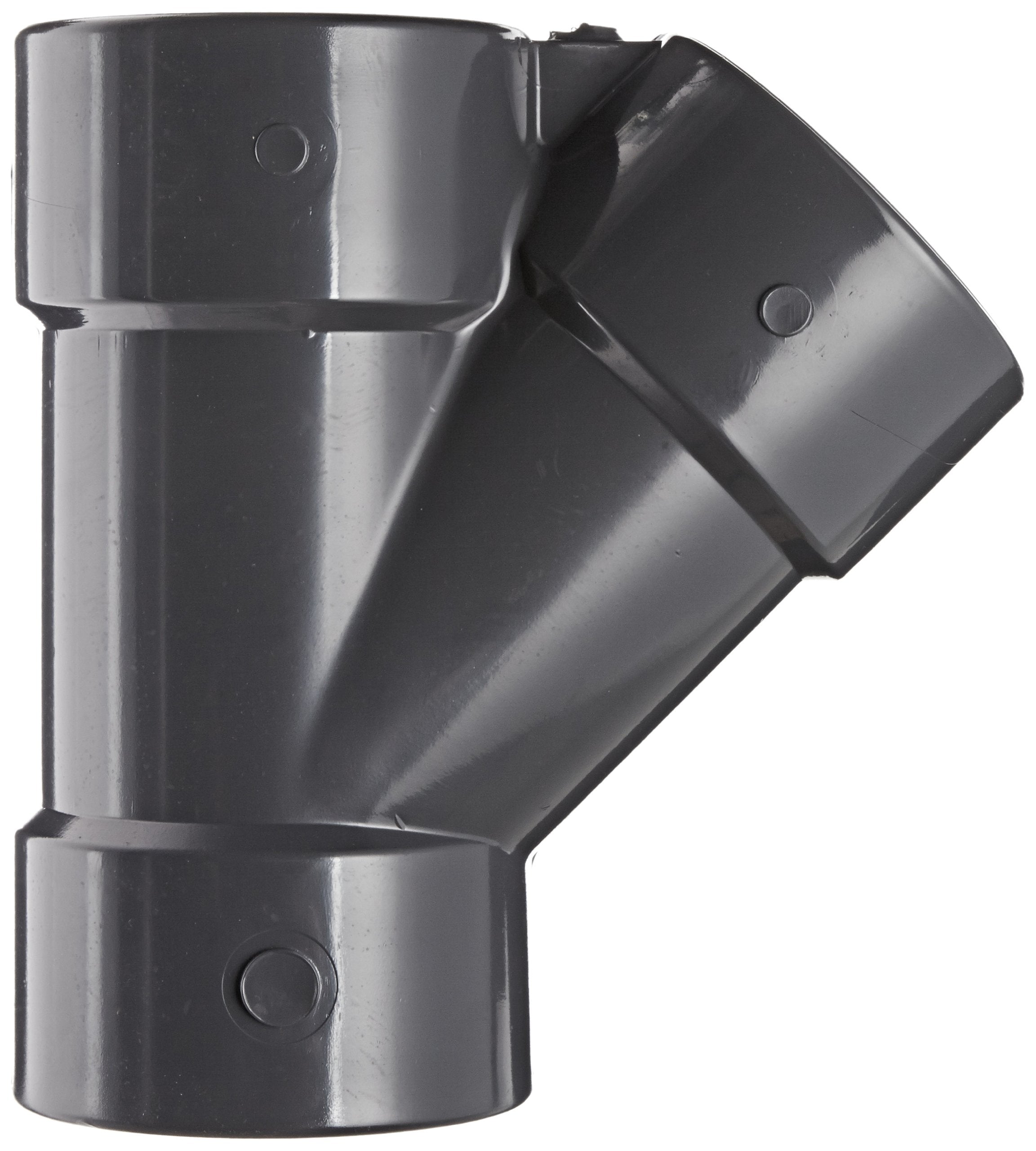 Spears Manufacturing offers the 875-040 Series PVC pipe fitting. This schedule 80 wye fitting has socket openings suitable for connecting and branching three pipes. Its Y-shaped design allows for the junction of one branch line at a 45-degree angle from the main run. The smooth bore design enhances flow and performance.