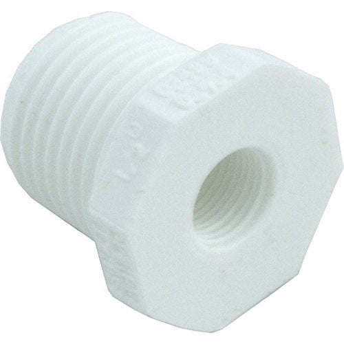 The SPEARS MANUFACTURING 439-07110/250 is a 1/2 inch by 1/8 inch PVC threaded bushing, suitable for various plumbing applications. This schedule 40 bushing is designed for connecting two different pipe sizes. It features a smooth interior wall, which minimizes pressure loss and helps maintain a higher flow volume.