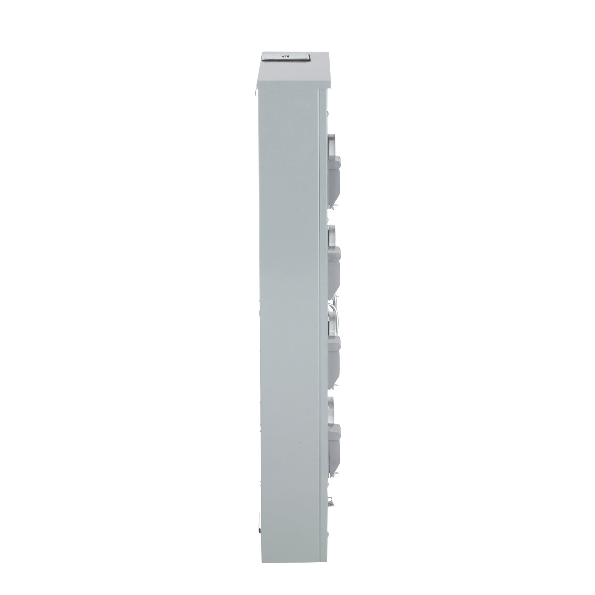 The Square D MP44125 Meter Pak Meter Center is engineered to cater to a wide variety of multi-metering applications. Suitable for both indoor and outdoor use, this UL-listed product adheres to EUSERC standards with a sturdy NEMA Type 3R construction. Featuring a 9-inch meter center spacing, the device allows the incorporation of more sockets, thus optimizing space and reducing the overall bulk of branch enclosures. Specifically, this model is equipped with four ringed meter sockets, no bypass, and a 4 jaw design capable of accommodating either overhead or underground service connections. A robust 400 ampere main bus complements the design, ensuring reliable energy distribution. At 48.12 inches tall, 24.34 inches wide, and 7.28 inches deep, the unit’s aluminum construction promises long-term durability.