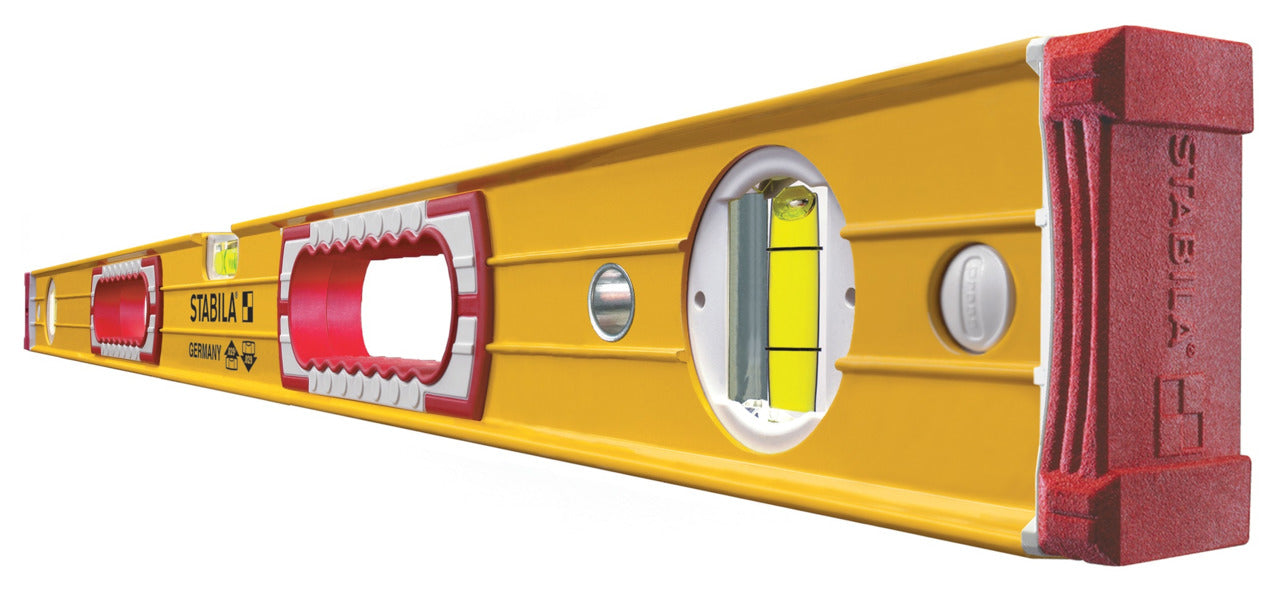 The Stabila 48 in. Aluminum Level with Hand Hole Type 196 features a durable aluminum construction. This level is suitable for professional use, ensuring accuracy in various applications. It is designed for easy handling with dual material hand holes for comfort and grip. Its removable end caps enable flush measuring, making it ideal for tight spaces. The special vial housing provides an increased viewing angle, assisting with accurate readings.