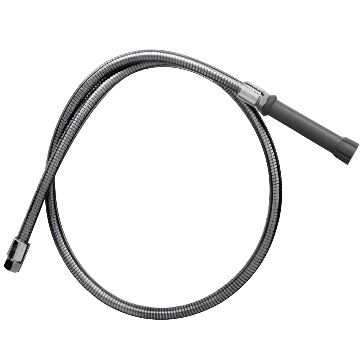T&S Brass B-0044-H is a flexible hose measuring forty-four inches long, designed for commercial kitchen applications. This product features a sturdy gray handle and is suitable for water supply fittings. The hose is made from stainless steel with a polyurethane inner tubing to ensure durability and reliability.