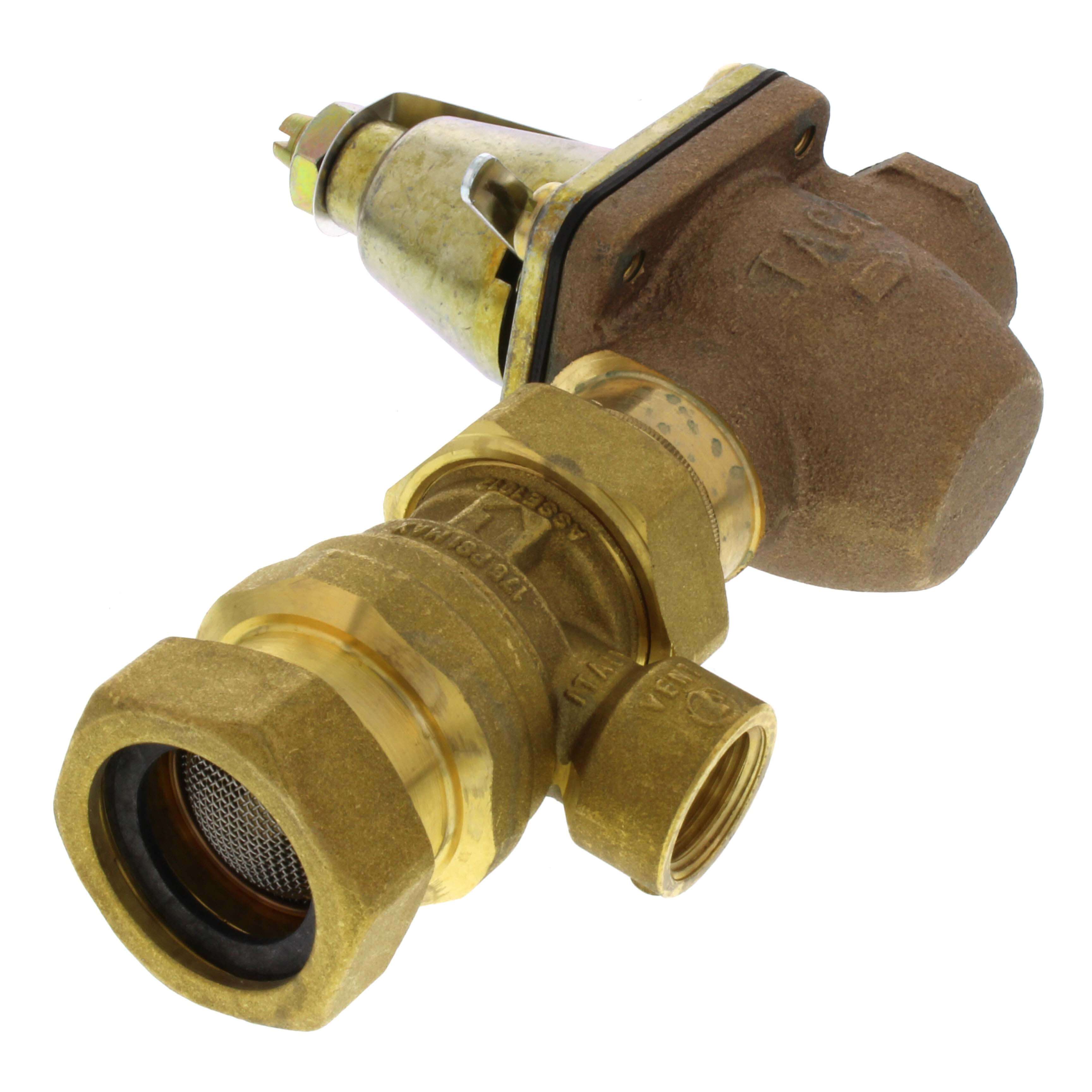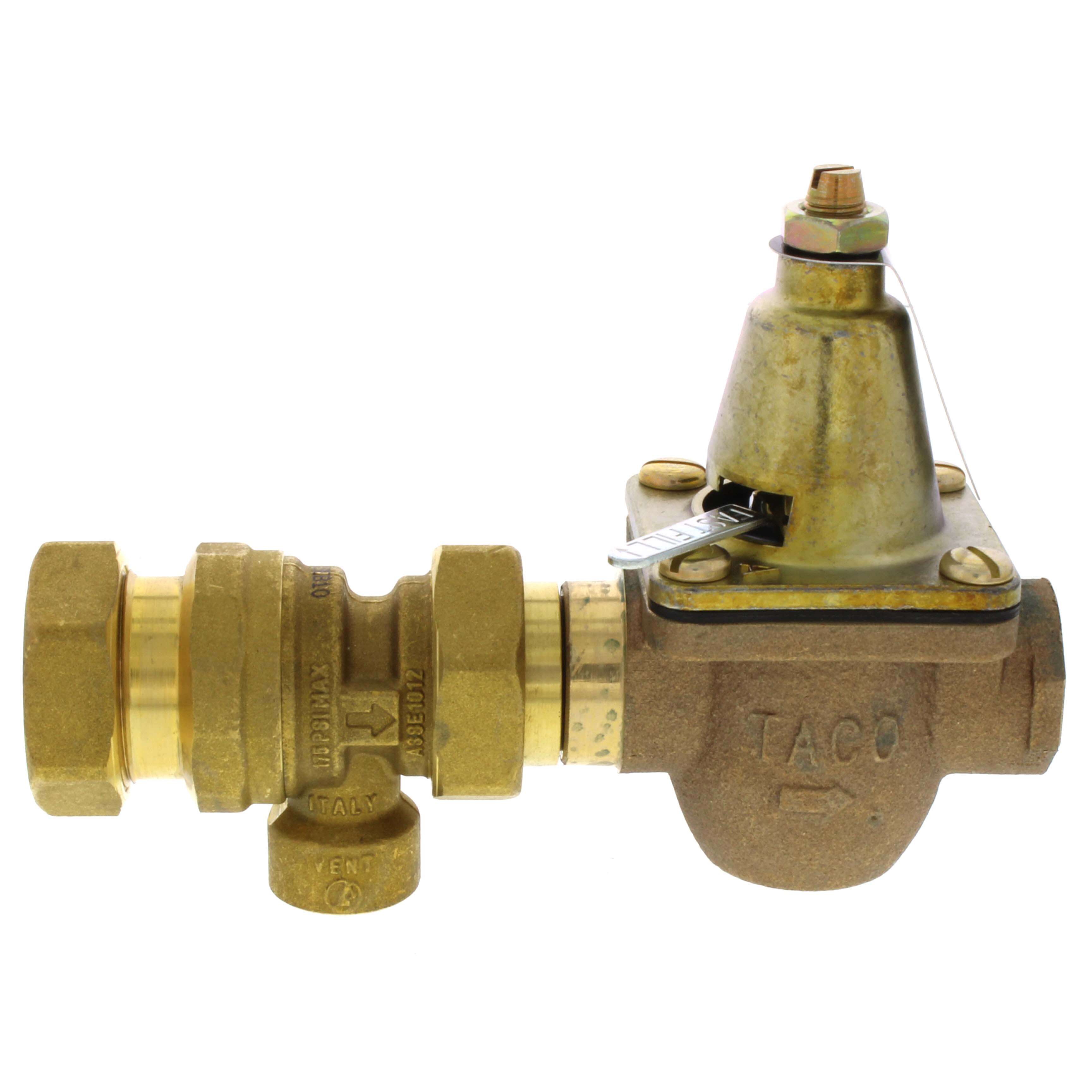 The Taco 3493-075-BC1 is a three-quarter inch brass combination boiler feed valve and backflow preventer. This product automatically replenishes water in a system when the pressure drops below the set level, ensuring consistent operation. The valve features a fast fill lever lock that allows for rapid water intake, preventing air from entering and maintaining system pressure.