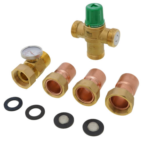 The Taco 5004-HX-C3-G is a reliable 1 sweat mixing valve designed for various heating applications. This mixing valve allows for the blending of hot and cold water, achieving the preferred temperature necessary for systems such as hydronic heating and domestic water heating. It features a built-in gauge for easy temperature monitoring, constructed from durable cast iron and rated for a maximum pressure of 150 psi.