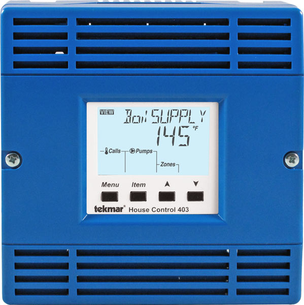The Tekmar Controls 403 is suitable for residential heating applications, providing efficient control for up to two heating temperatures and supporting various boiler setups.