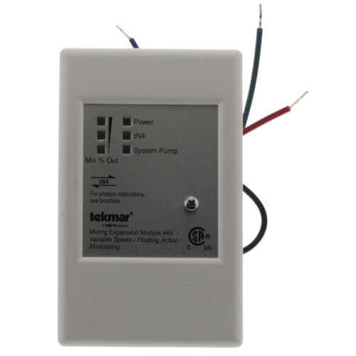 The Tekmar Controls Mixing Expansion Module 444 offers control options for variable speed injection pumps and floating action actuators. It supports analog signals such as 0-10 V (DC), 2-10 V (DC), 0-20 mA, or 4-20 mA. This module also includes an output for a system pump. Note that the 444 requires a tN4 System Control for operation.