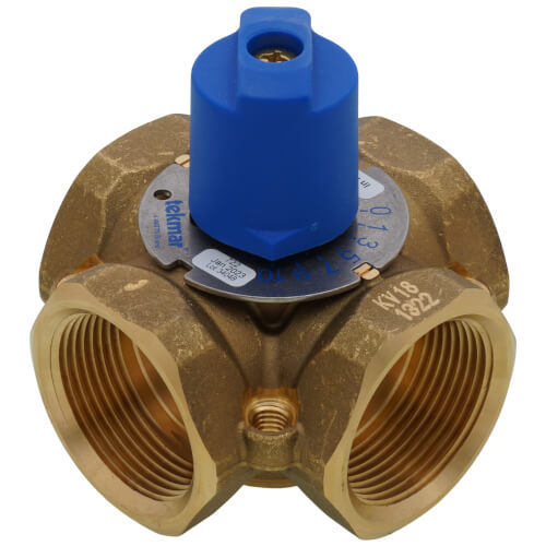 The Tekmar Controls 722 is a 1 1/4 inch 4-way mixing valve designed for hydronic heating systems. This valve mixes supply water from a heating source with returning water from the system. It operates effectively in both closed and open loop systems. The valve features standard female NPT threads for easy installation.