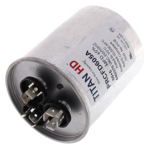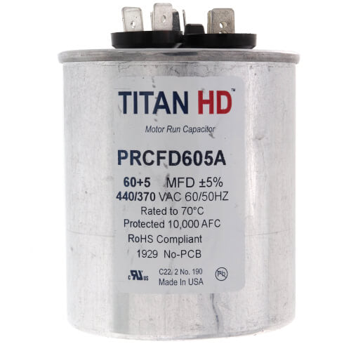Titan HD PRCFD605A is a dual run capacitor that operates at 440/370 volts. This round run capacitor is designed to meet the needs of HVAC professionals. It provides reliable operation for air conditioning and refrigeration systems.