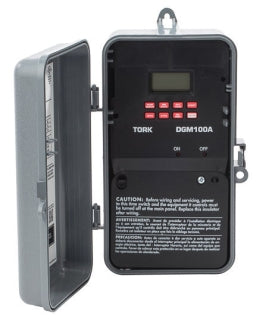 The Tork DGM100A is a 120/277 VAC 60 Hz digital time switch with a 20 Amp rating. It features a 365/7 day timer and can control various applications.