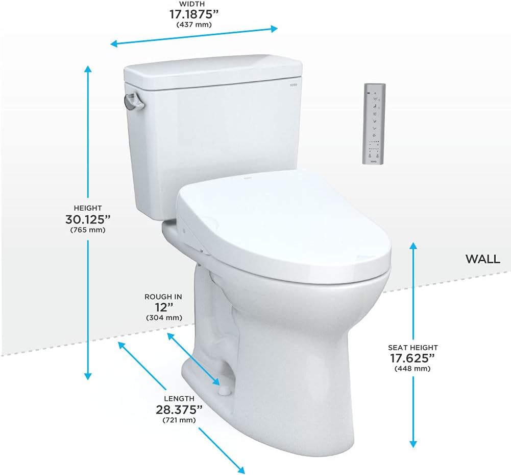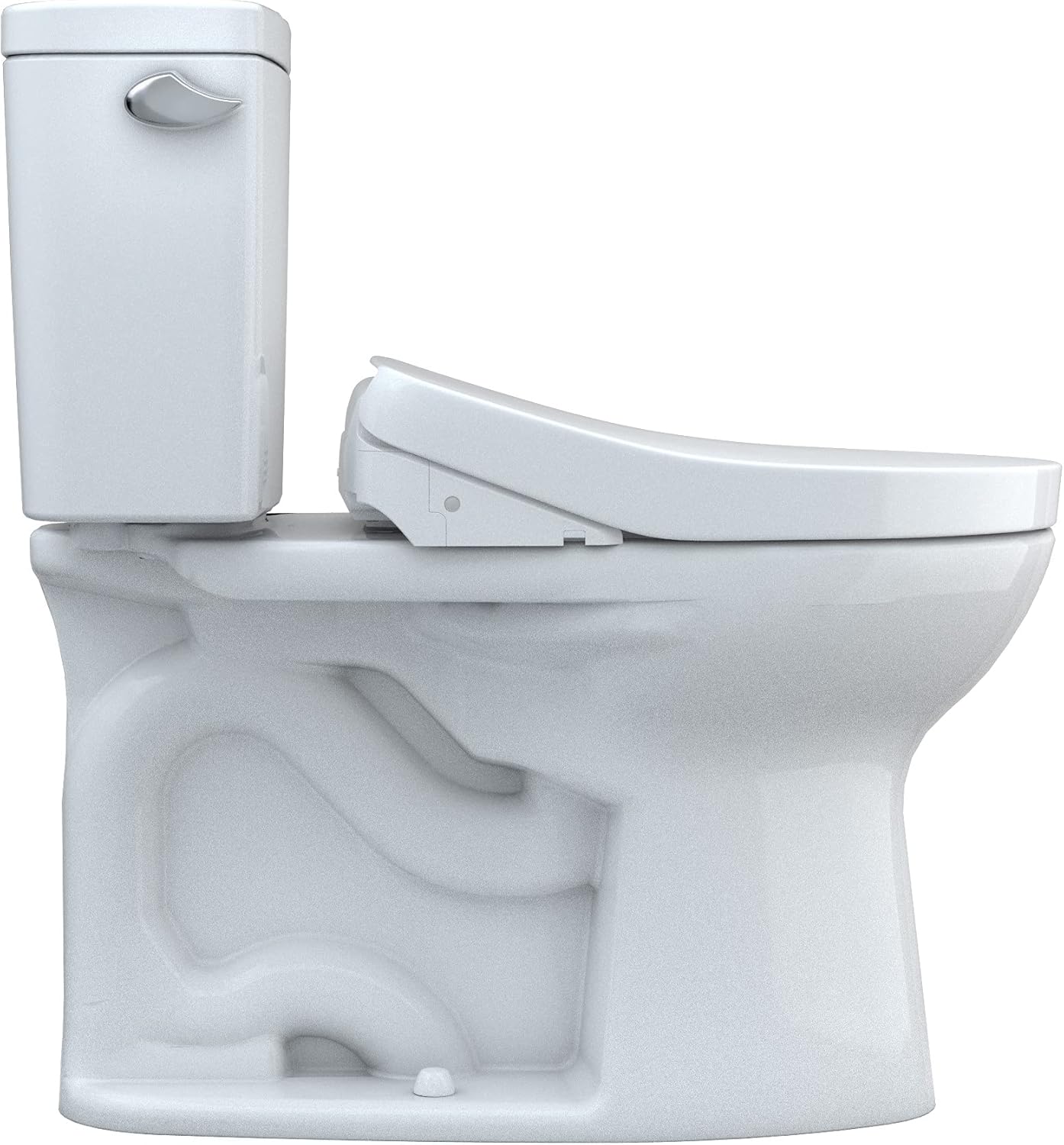 The TOTO Drake Washlet+ offers a seamless, clean design with a concealed connection. It features the TOTO EWATER+ system and PREMIST function for enhanced hygiene. The fully automated WASHLET S500e provides an adjustable heated seat, warm water spray, and air dryer capabilities.