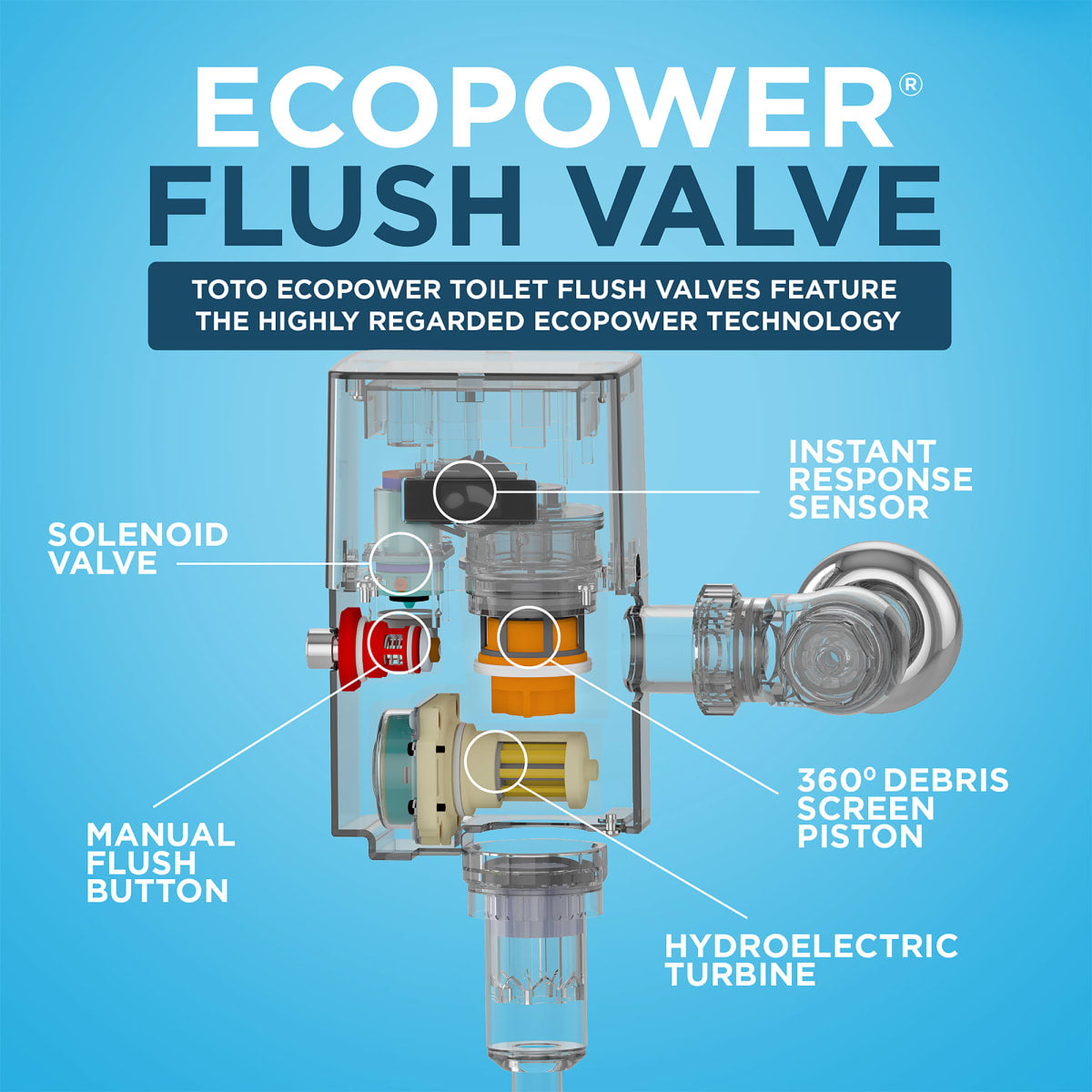 The Toto ECOPOWER 1.6 gallons per flush toilet flushometer valve, model TET1GB32#CP, is designed for high-traffic environments. This valve provides an efficient water conservation solution without needing electricity or battery replacement. The ECOPOWER system harnesses the energy of running water to generate electricity, which powers the valve's sensor for reliable operation. The valve features a self-adjusting sensor to prevent unnecessary flushing, effectively saving water.