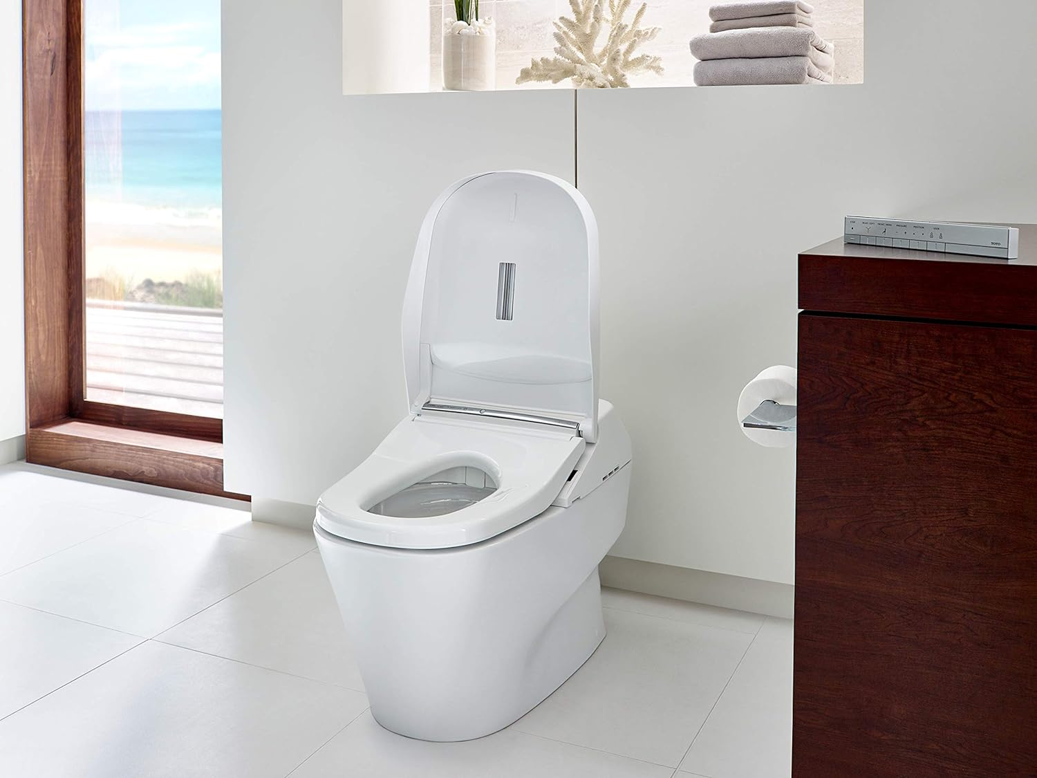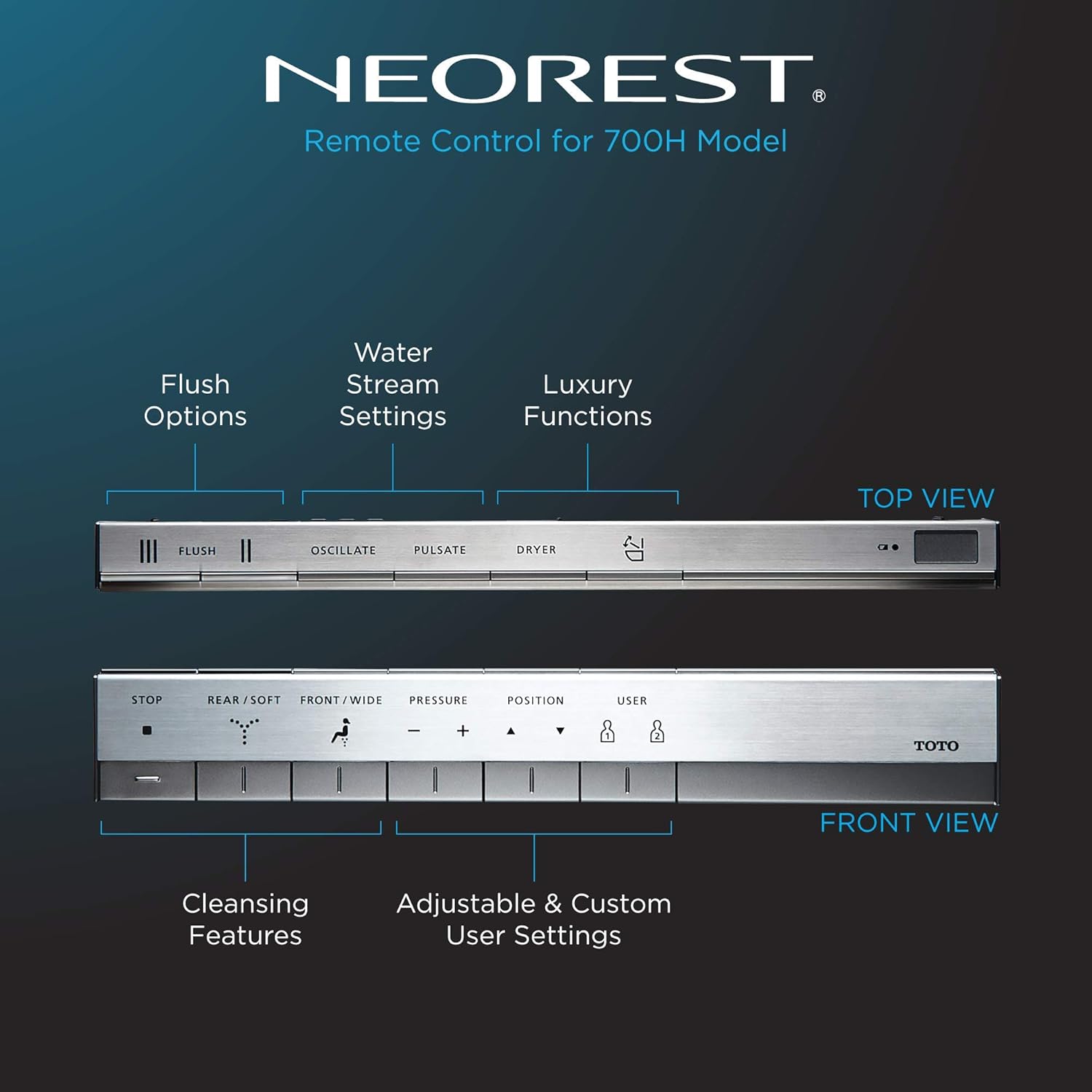 This TOTO Neorest 700H toilet features a cyclone siphon jet flushing system for ultra-high efficiency, a convenient remote control, and a powerful hands-free automatic flush system. The heated seat includes adjustable temperature settings, providing additional comfort.