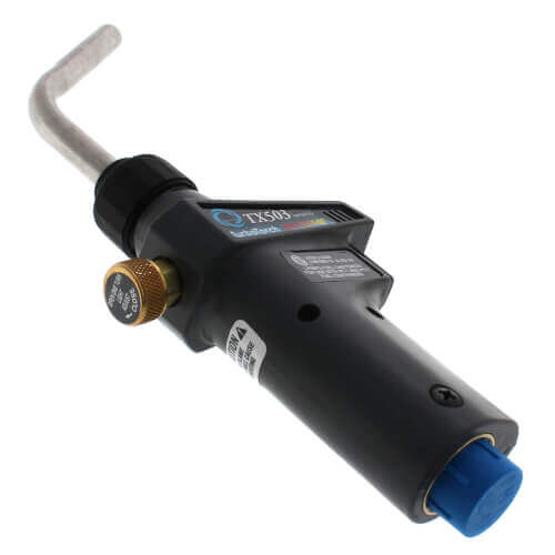The TurboTorch 0386-1297 TX503 is a self-lighting soldering torch designed for efficient heating and brazing tasks. It features Extreme Swirl Technology, which enhances combustion and delivers higher heat outputs, making it suitable for various plumbing applications.