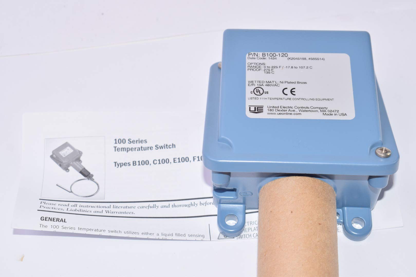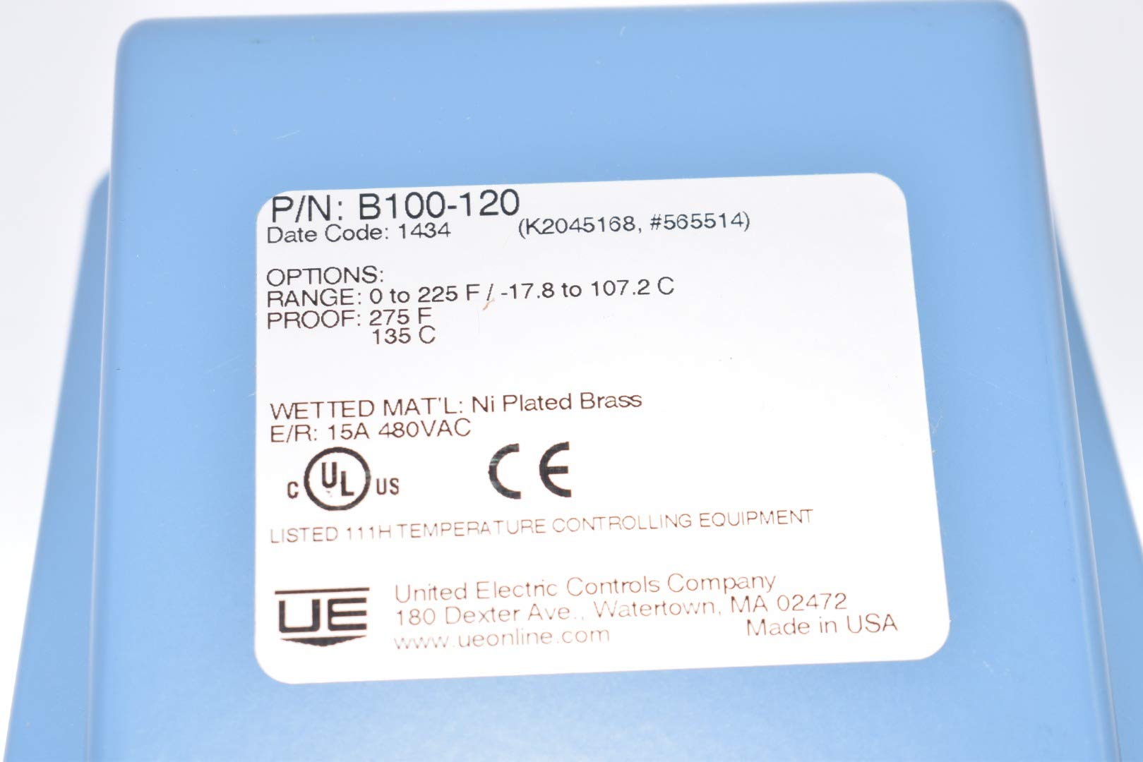 The United Electric B100-120 Temperature Controller efficiently manages temperature regulation within an environment, ensuring stability and safety. Manufactured by United Electric, a trusted name in the industry, this temperature controller operates effectively within a range of 0 to 255 degrees Fahrenheit.