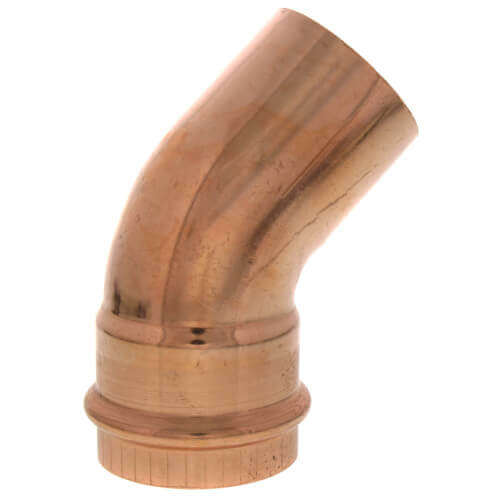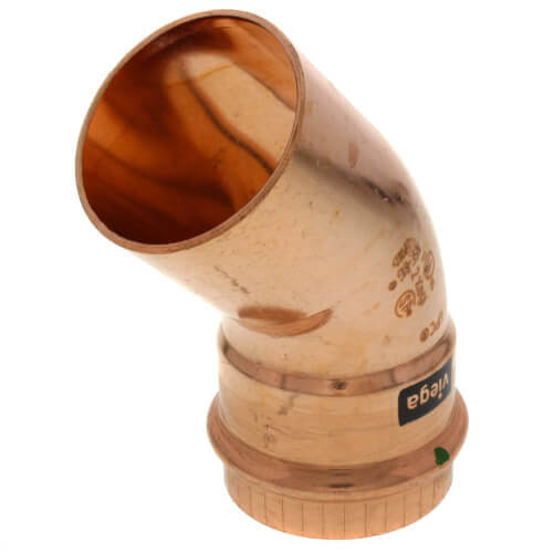 The Viega 20678 ProPress Zero Lead Copper XL-C 45-Degree Elbow features a four-inch FTG x Press connection, designed for facilitating directional changes in piping systems. This elbow is engineered from high-quality copper, ensuring durability and reliability for plumbing and heating applications.