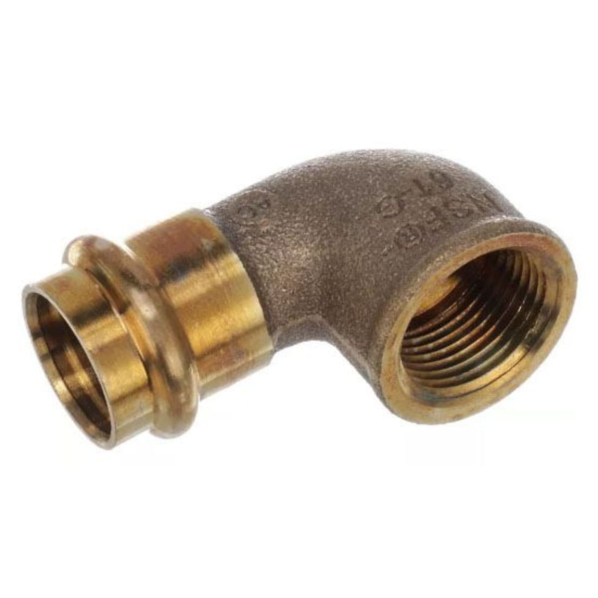 The Viega 79530 is a 90-degree elbow fitting designed for plumbing applications. This product features a press connection with a female pipe thread. It is suitable for use with ASTM B88 tubing and is made from lead-free bronze material.