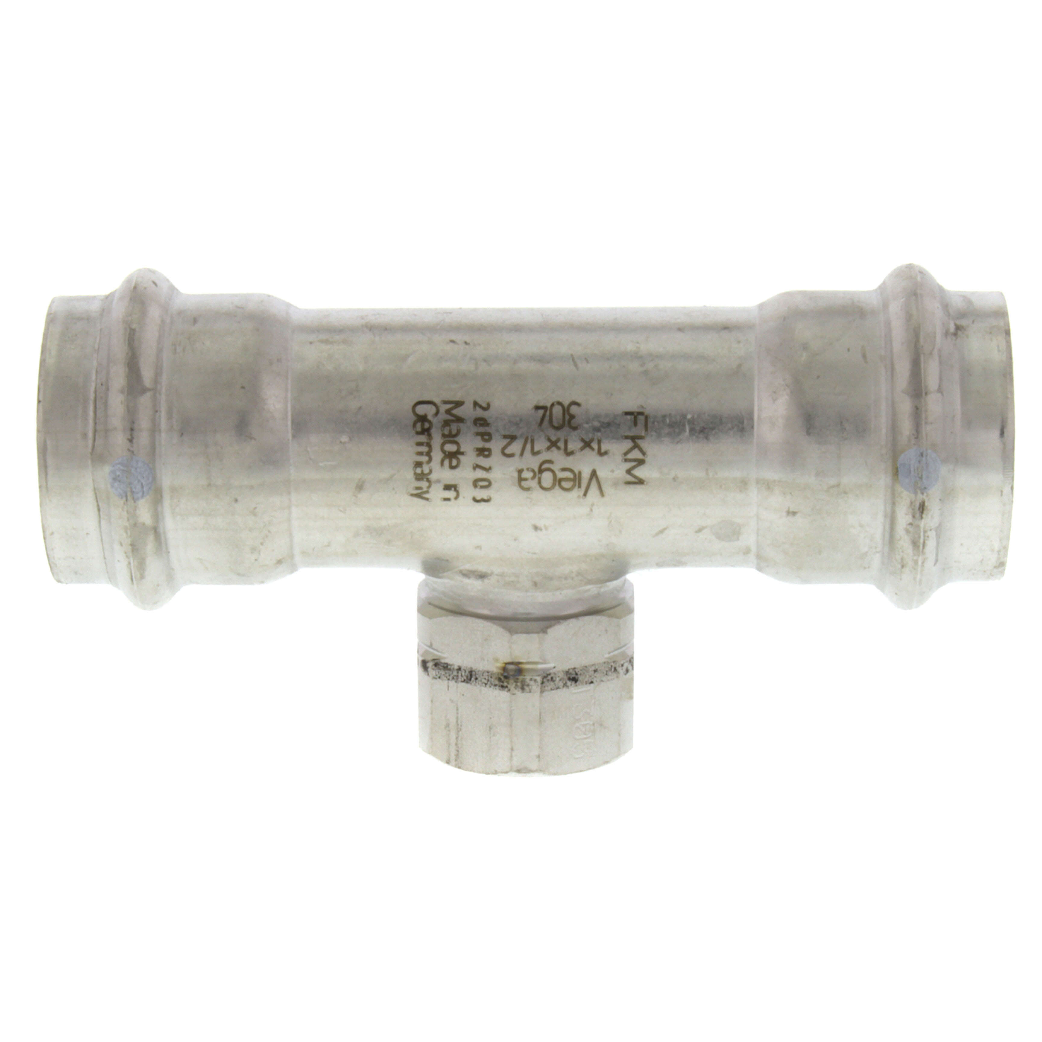Viega 85842 is a ProPress 304 Stainless Steel Reducing Tee designed for plumbing applications. This tee connects pipes with a unique combination of ProPress and FNPT connections. The Smart Connect feature assists in achieving reliable joints.