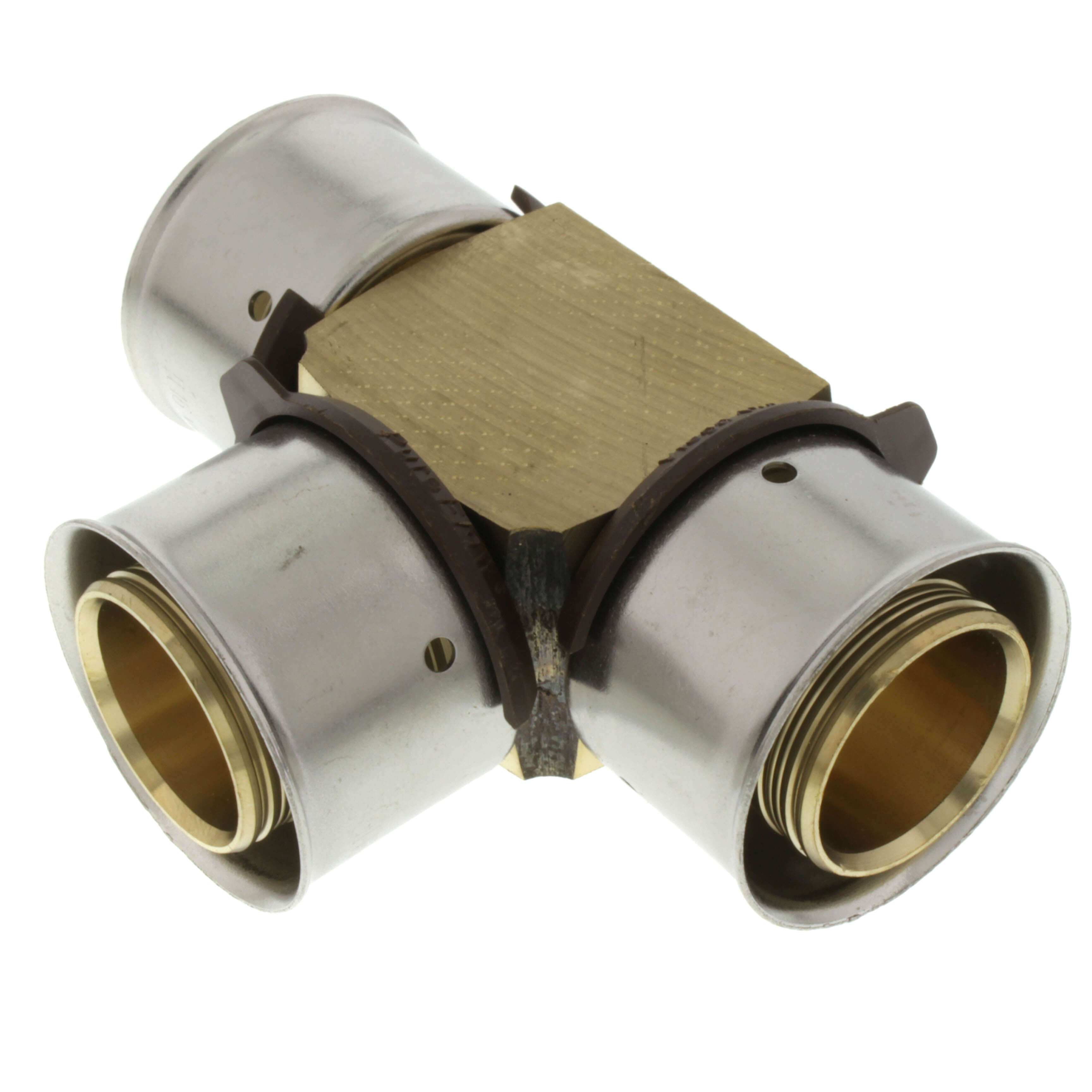 The Viega 94070 is a PEX press tee made from zero lead bronze. It connects three PEX pipes with a nominal size of one and one-quarter inches. This tee fitting is designed for press connections, which allow for quick and secure installations without the need for flame, solder, or heavy equipment.