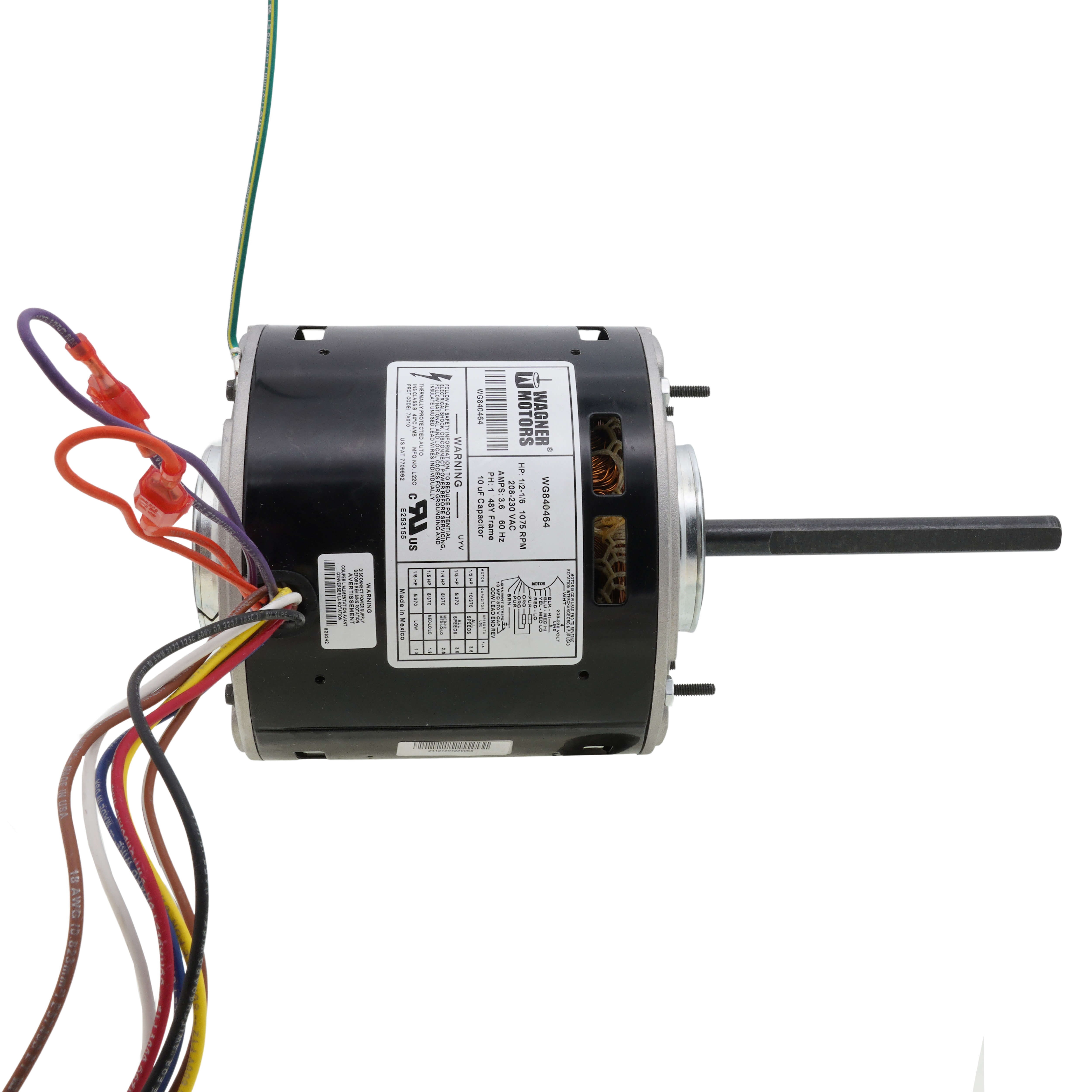 DiversiTech WG840464 is a 1/2 - 1/6 horsepower direct drive furnace blower motor. This motor operates at 208-230 volts and runs at 1075 RPM. It is designed for the HVAC aftermarket, suitable for various heating applications.