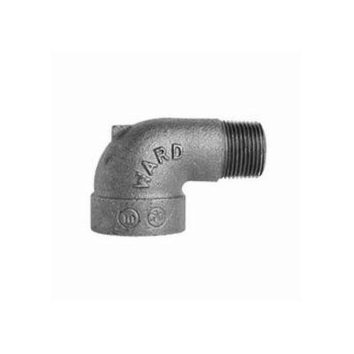 Ward Manufacturing 1B.NMSL is a 90-degree street elbow fitting. This fitting connects male National Pipe Thread (MNPT) to female National Pipe Thread (FNPT). It is made from galvanized malleable iron and is rated for a pressure class of 150 lb. The fitting works well in various plumbing applications, ensuring a strong and leak-proof connection.