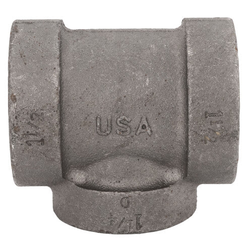 The Ward 1DX1B.BCT is a black cast iron reducing tee designed for plumbing applications. It features a connection size of one and one-half inches by one and one-half inches by one and one-quarter inches, with threaded connections (FNPT). The tee is manufactured under strict quality control standards, ensuring durability and a leak-proof seal.