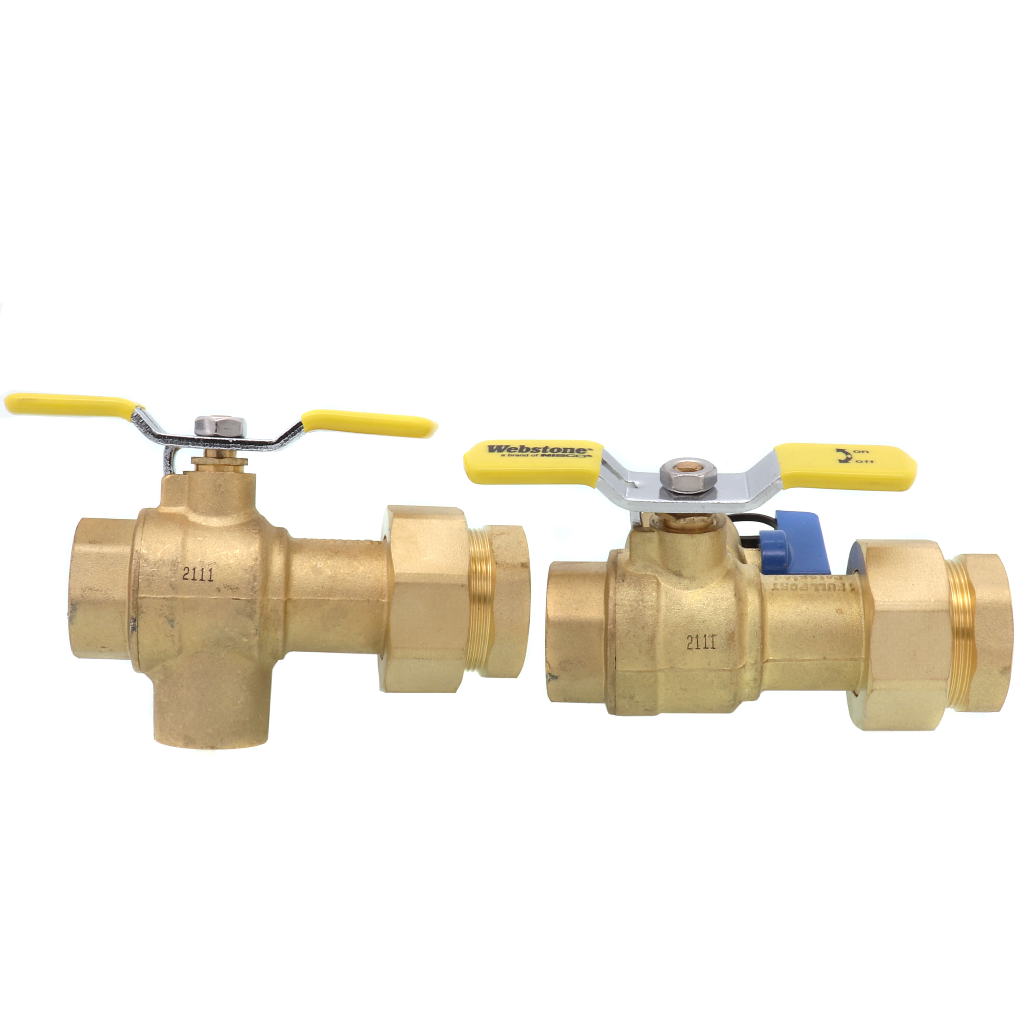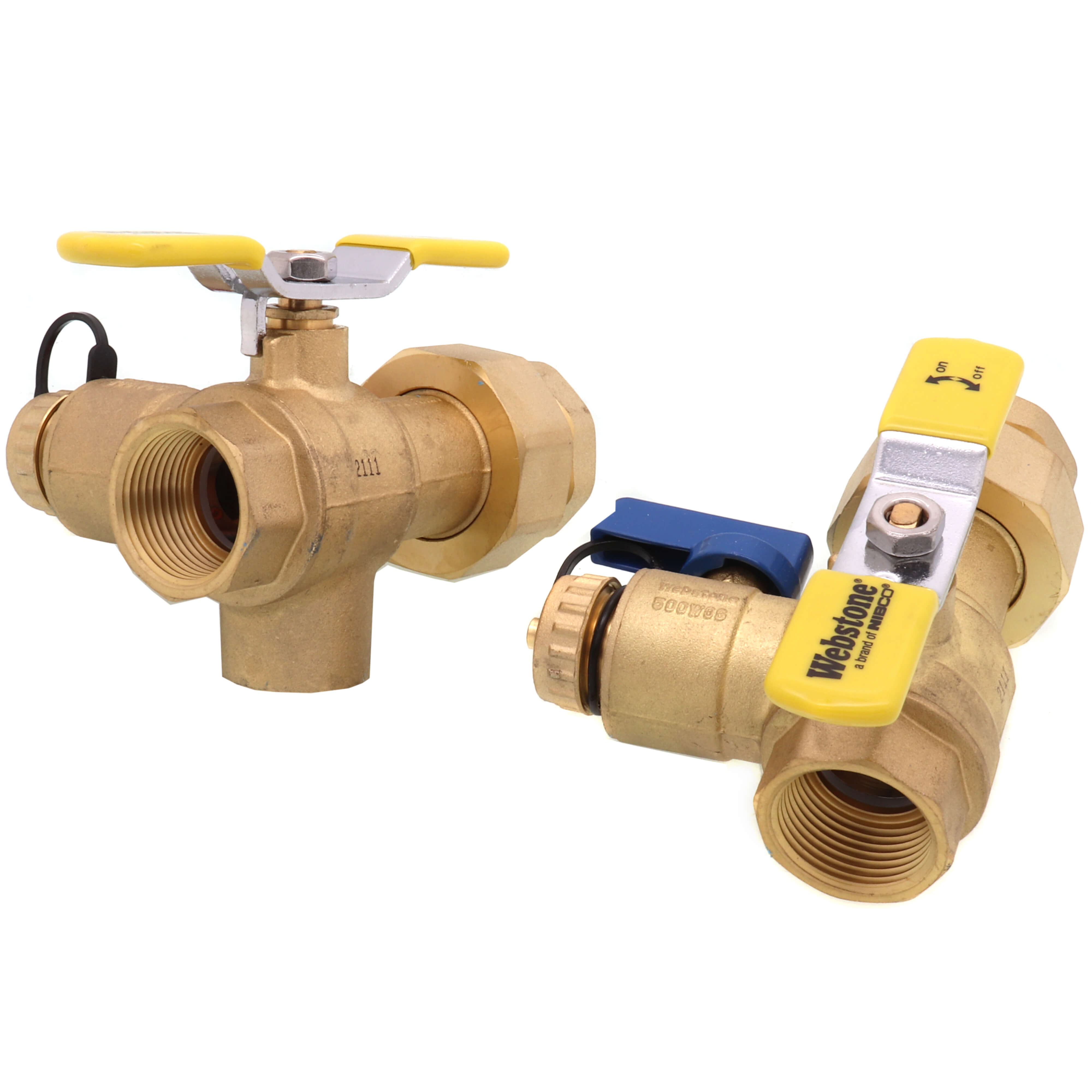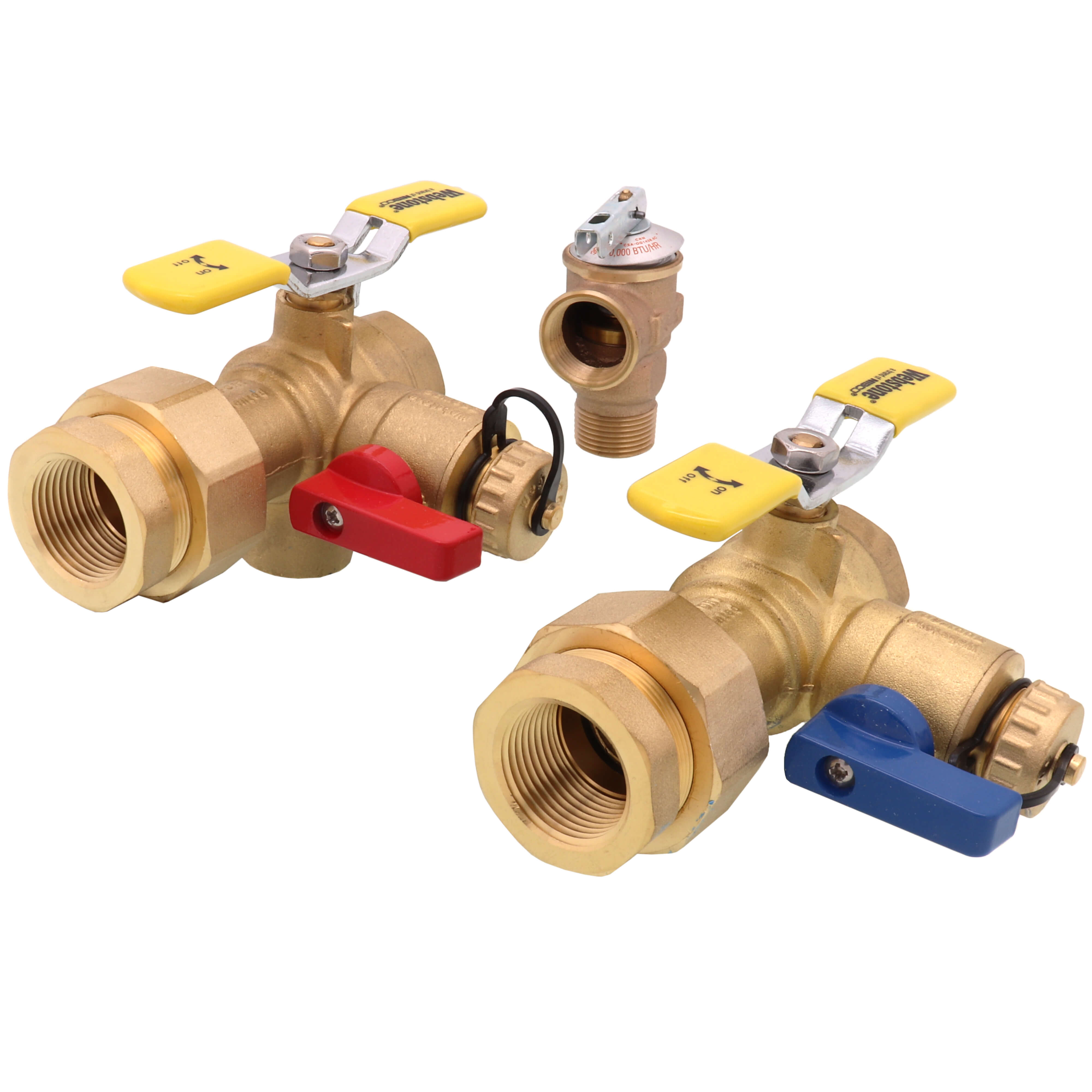 The Webstone H-44444PR3 is a service valve kit designed for tankless water heaters. This kit facilitates maintenance and isolation for tankless water heating systems. It includes a hot and cold set of full port forged brass ball valves with hi-flow hose drains and a pressure relief valve outlet.