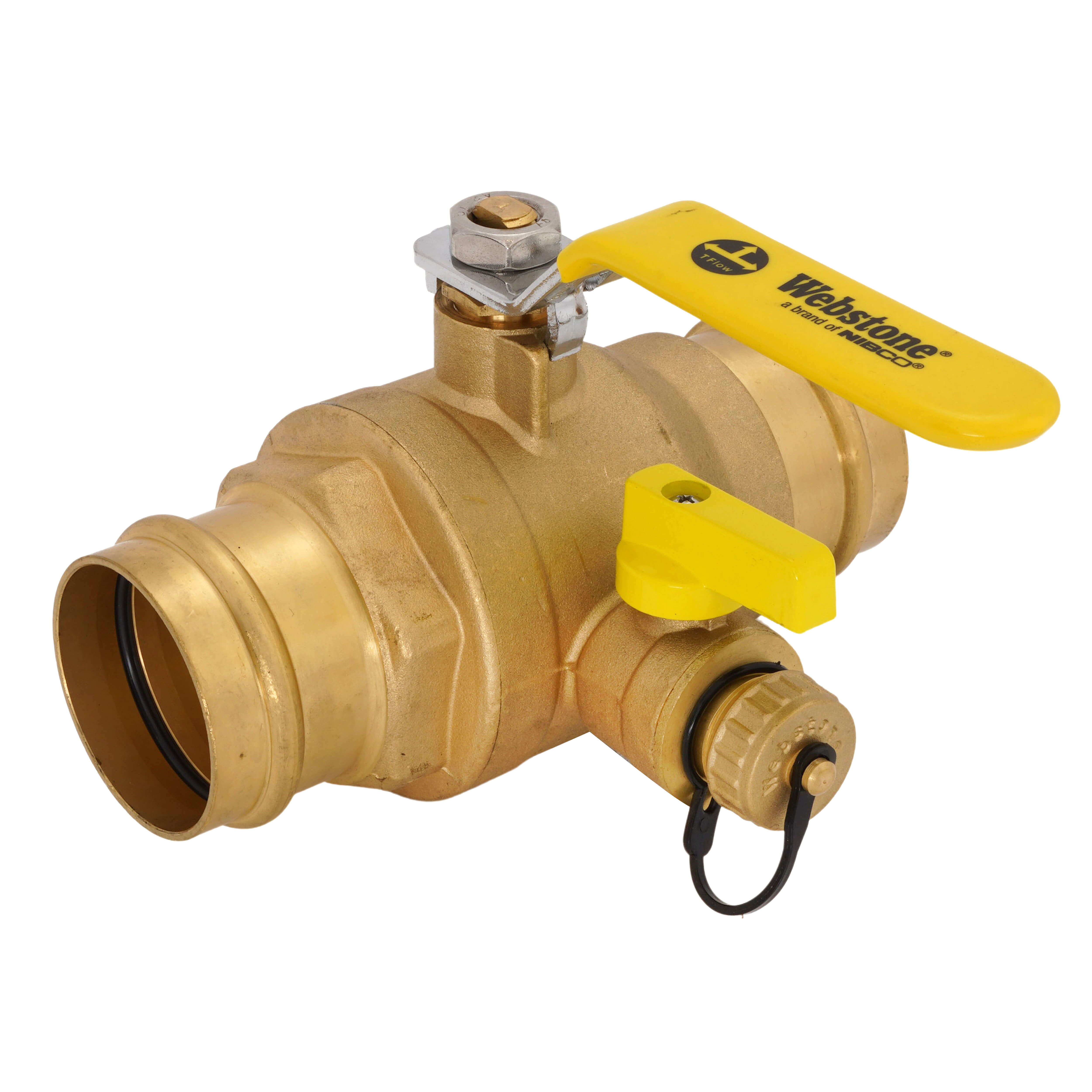 The Webstone H-80617 is a lead-free two-inch press full port ball valve with drain and a reversible handle. This ball valve effectively regulates flow in plumbing applications. It is made from durable brass material, ensuring longevity and reliability.