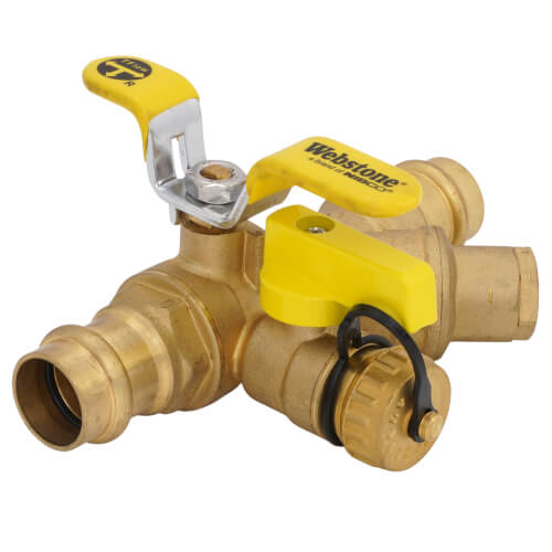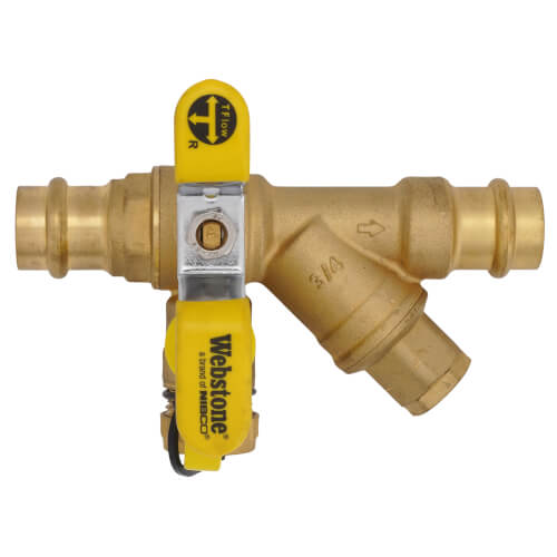The Webstone H-81563W is a 3/4 press lead-free Pro-Pal ball drain strainer designed for efficient system operation in plumbing and heating applications. This product features a full port forged DZR brass ball valve equipped with a hi-flow multi-function hose drain.