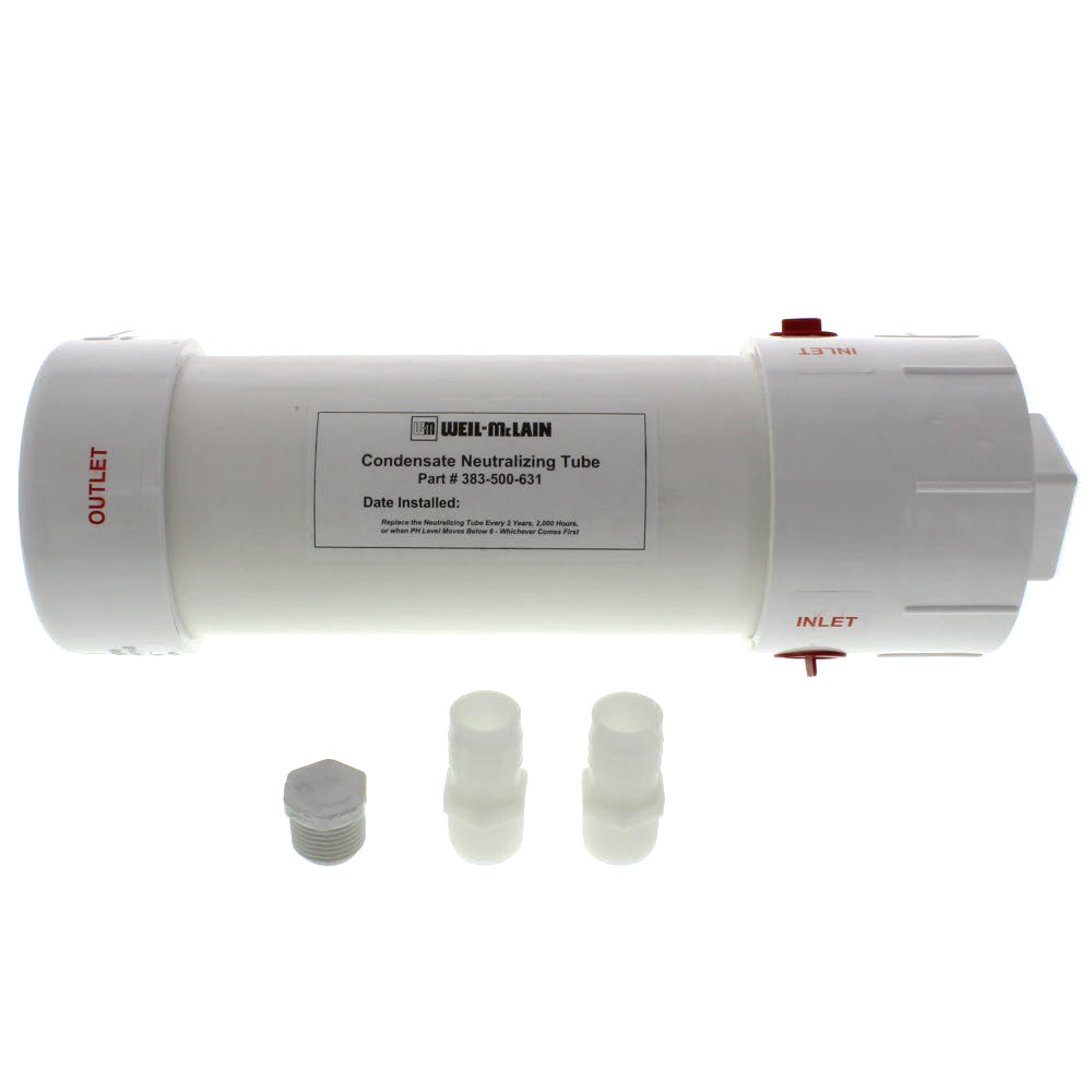 The Weil Mclain 383-500-631 Condensate Neutralizer Kit is designed for use with Weil Mclain residential high efficiency condensing boilers. It neutralizes the acidic condensate generated by these systems, preventing damage to piping and components.