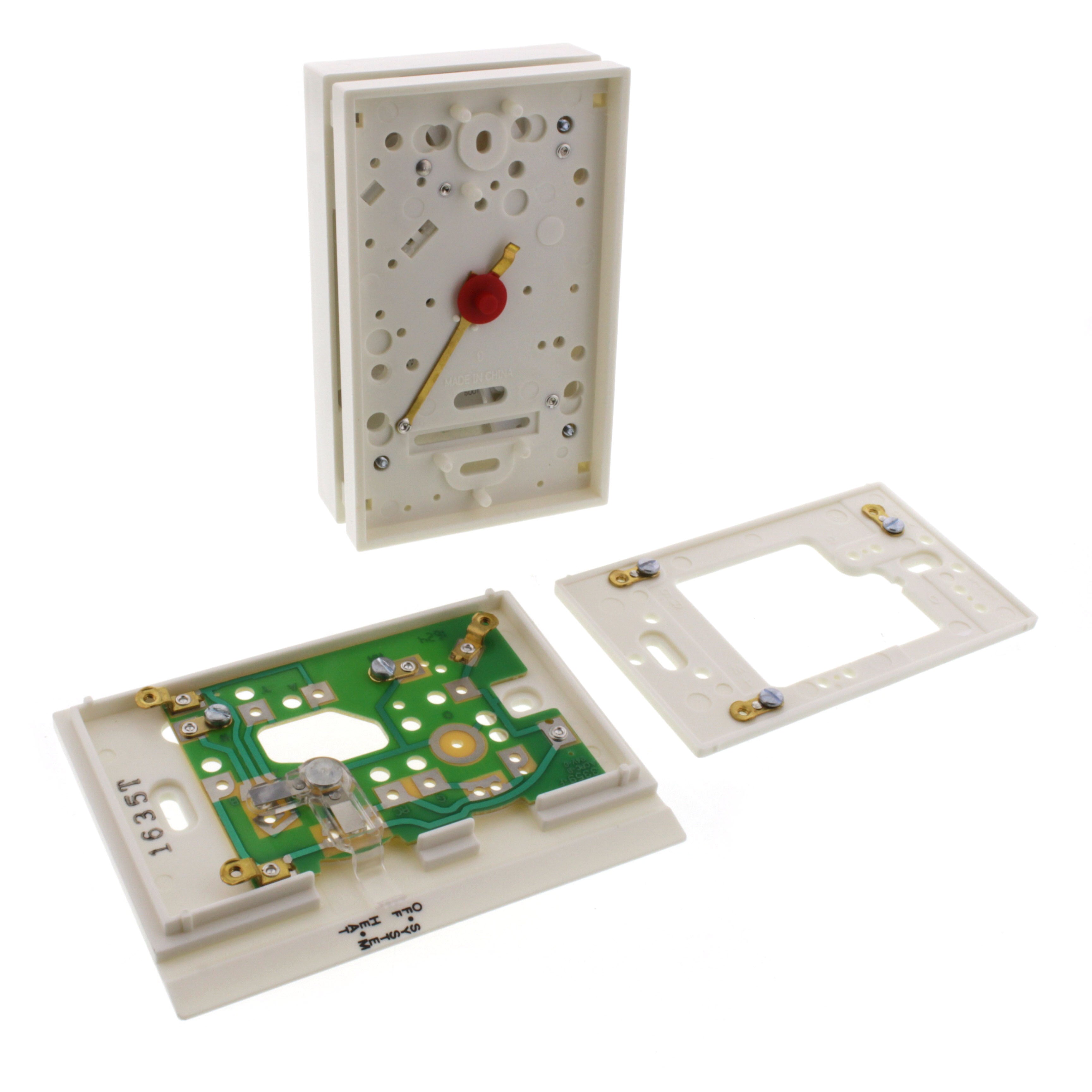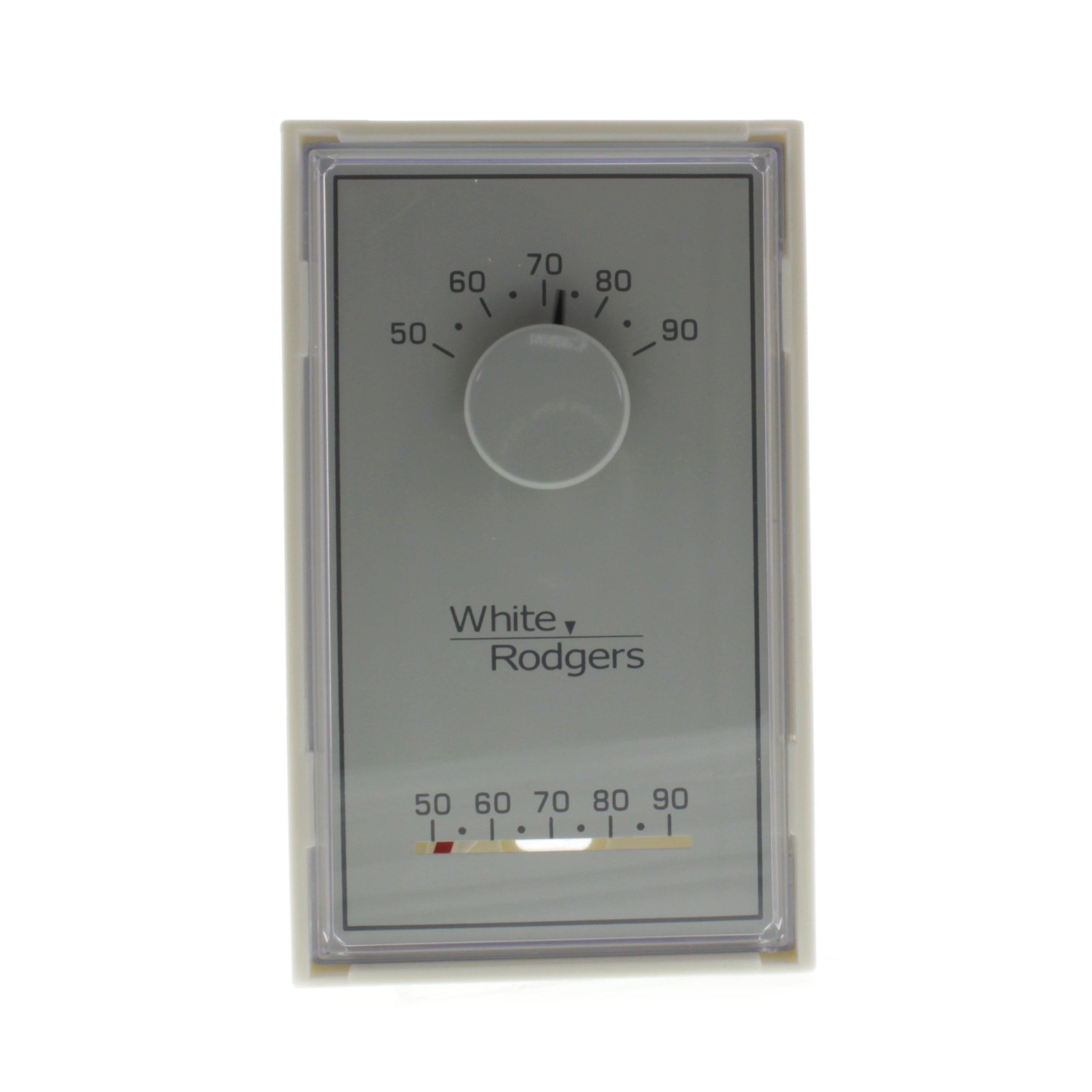 The White Rodgers 1E50N-301 is a 24-volt single stage heating thermostat designed for precise temperature control in residential and commercial environments. This model features a snap action contact system switch allowing for settings of heat, off, or fan mode. It includes a temperature locking kit to prevent unauthorized adjustments. The thermostat operates within a temperature range of fifty to ninety degrees Fahrenheit and is suitable for various heating applications.