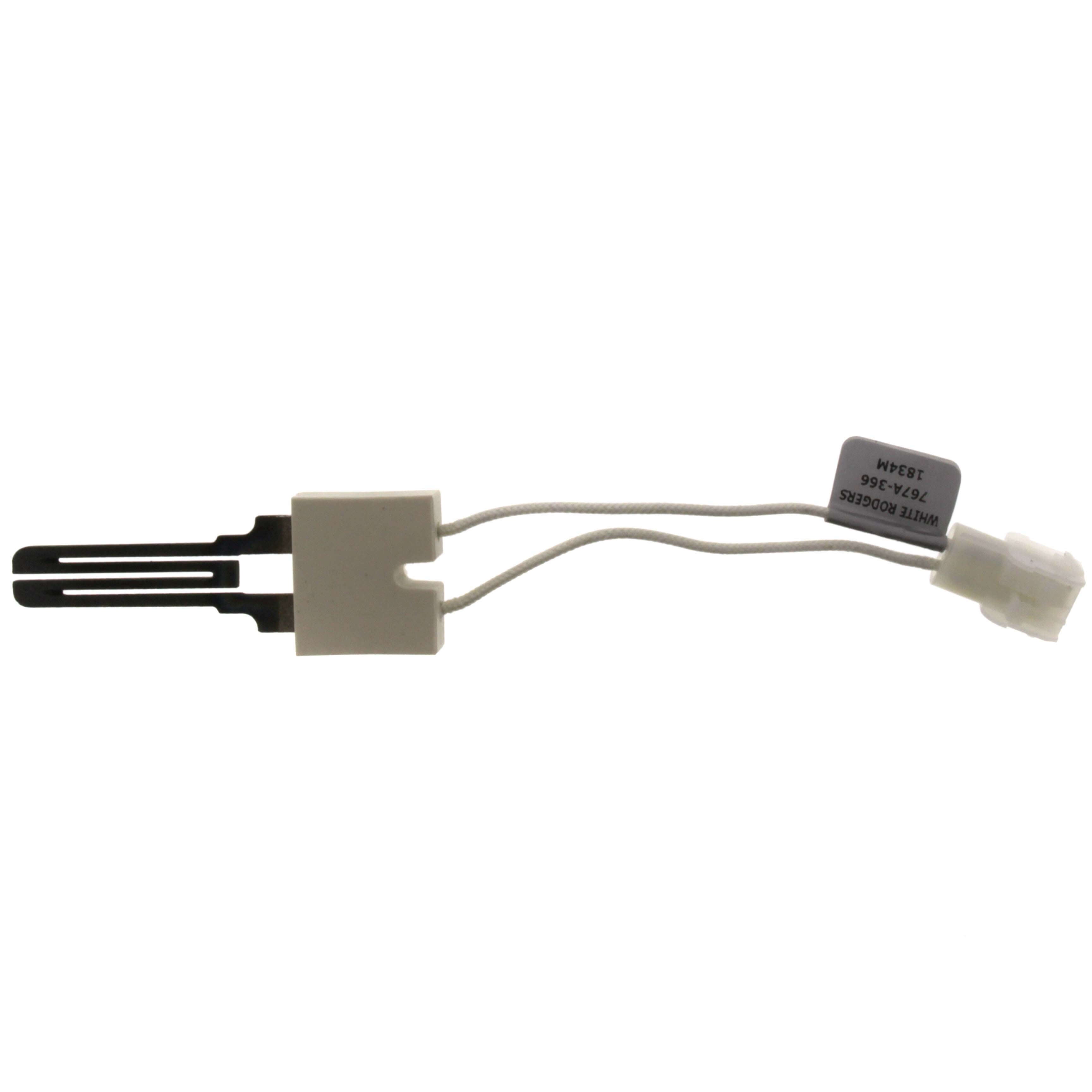 The White-Rodgers 767A-366 ignitor is designed for use in gas appliances. It features a lead length of five point three one three inches, operates at one hundred twenty volts AC, and utilizes silicon carbide material for reliable ignition.